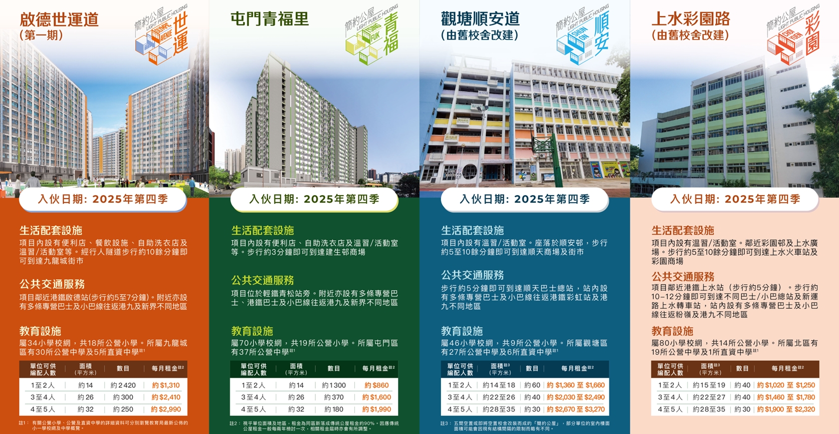 發言人續說,同時,位於元朗攸壆路約2100個「簡約公屋」單位已在今年6月中全面入伙,而作為第二個落成及首個位於市區的牛頭角彩興路「簡約公屋」項目約2290個單位亦預期快將完成入伙,充分反映租金便宜、配套服務齊全、居住環境更好的「簡約公屋」項目,相當受有需要的市民歡迎。房屋局剛公布2025年第二季公屋綜合輪候時間,一般申請者的綜合輪候時間下降0.2年至5.1年,是2018年第一季以來的最低位;而當中「簡約公屋」的一般申請者的輪候時間平均為2.3年,可見「簡約公屋」能快速回應急需改善居住環境家庭的需要。此外,約七成彩興路「簡約公屋」的住戶原先居住在不適切住房,例如「劏房」、天台屋和床位等,他們入住「簡約公屋」後生活即時得以大幅改善,因此呼籲有需要而又符合資格的市民盡快遞交申請。