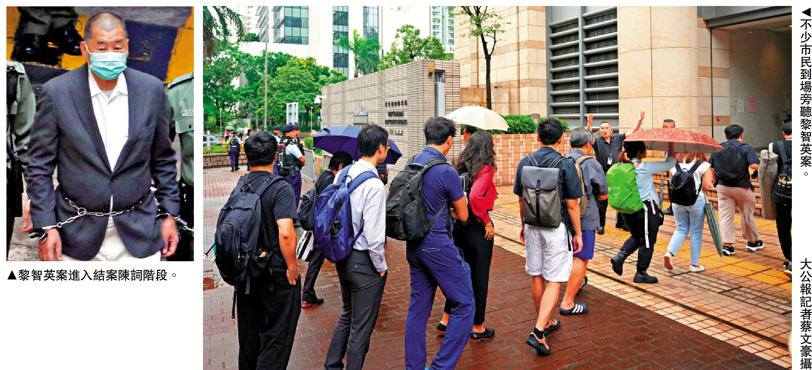 控方表示,其書面結案陳詞長達860頁,口頭結案陳詞預計需時兩日,主要集中討論法律議題及證據。控方強調,黎智英在《香港國安法》生效前後一直請求西方國家制裁香港,並勾結外國勢力,而該案從犯證人的作供中亦有相關文件佐證。控方毋須證明串謀協議在何時何地達成,只須證明串謀行為在《香港國安法》生效後繼續便可。
