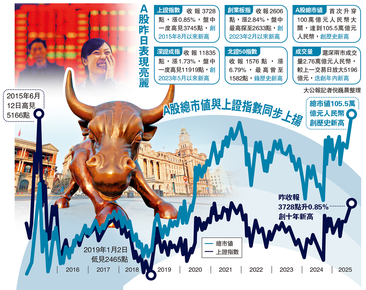 (大公報 記者 倪巍晨)A股市場近期持續走強,主要指數聯袂創下階段性新高。昨日滬綜指收報3728點,漲幅0.85%,創下2015年8月以來新高;深證成指收於11835點,上漲1.73%,刷新2023年5月以來紀錄;創業板指升見2023年2月以來新高,北證50指數更創歷史新高。滬深兩市昨日成交2.76萬億元(人民幣,下同),較上一交易日放大5196億元,迭創年內新高。