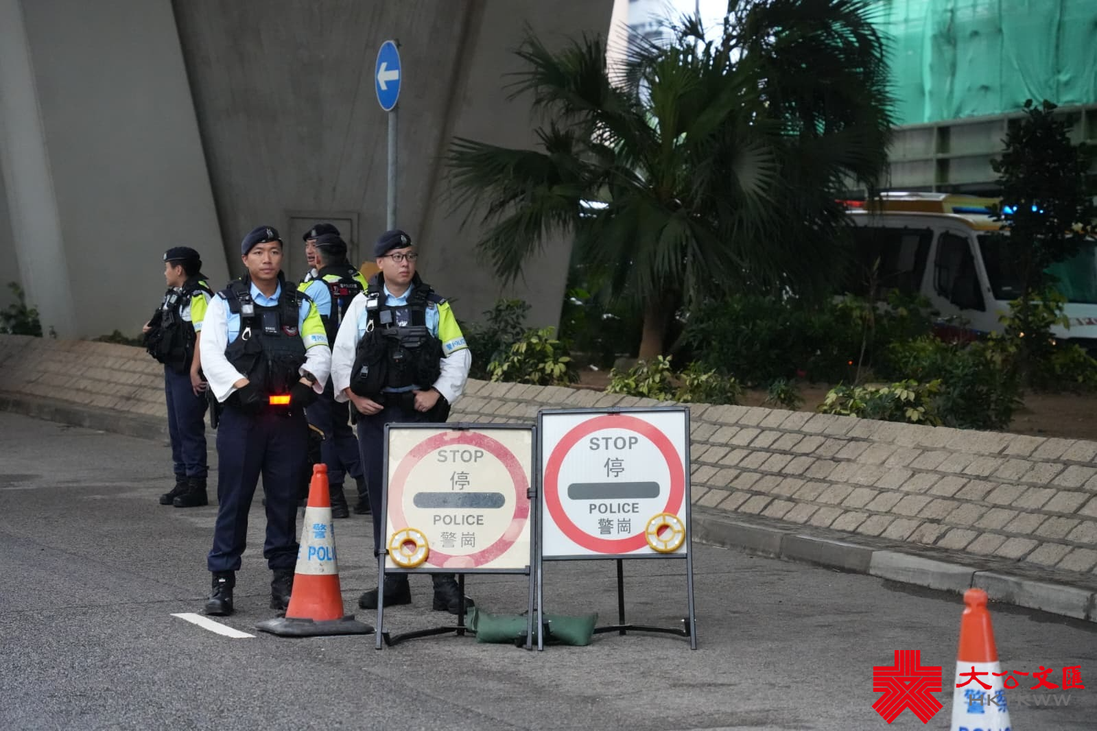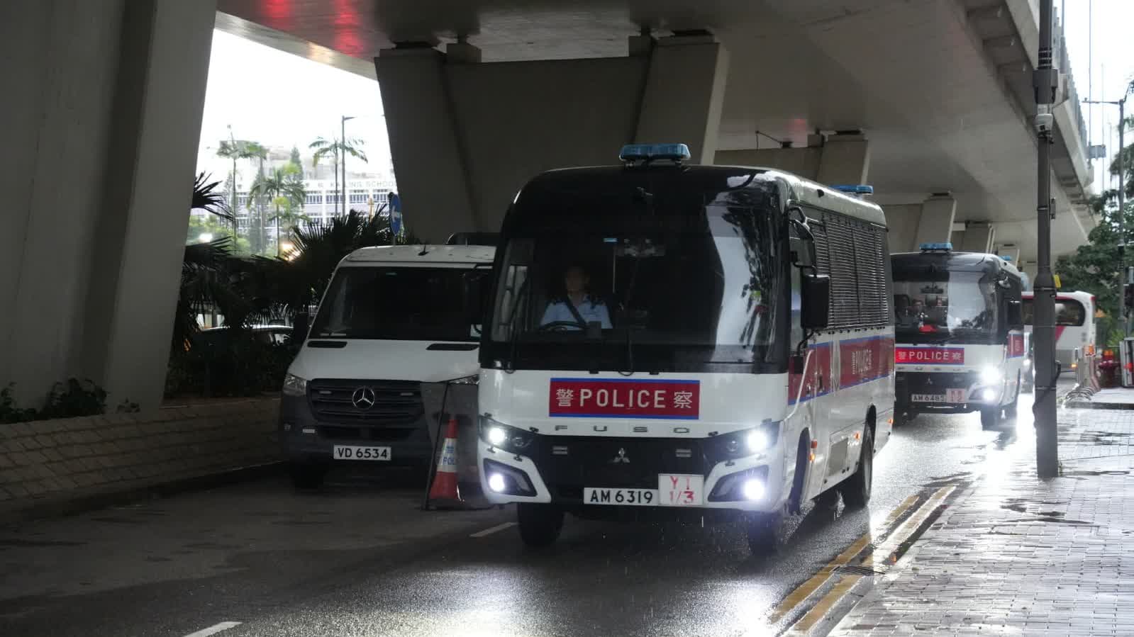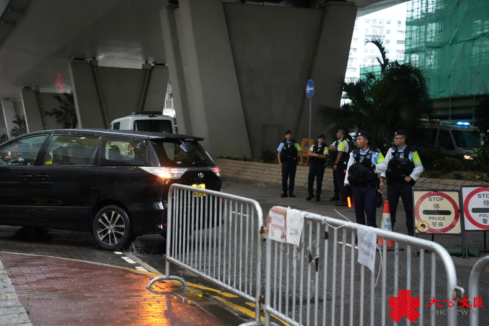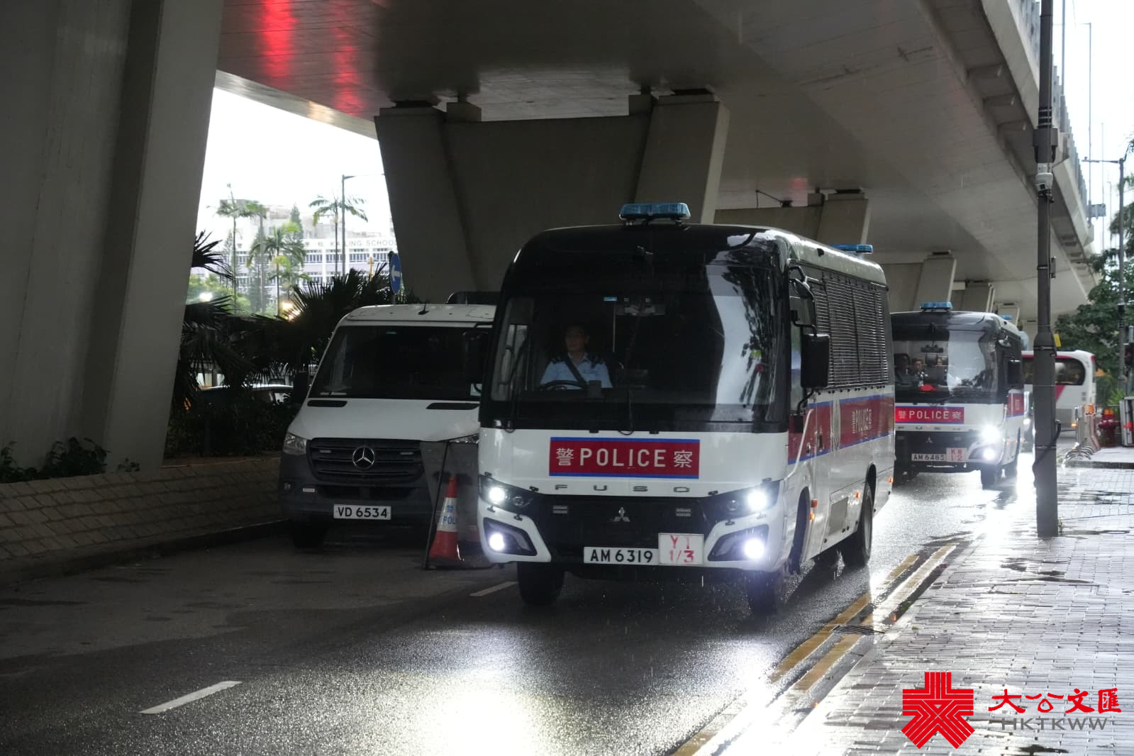 案件於西九龍裁判法院(暫代高等法院)進行審理,控方今日(19日)繼續結案陳詞。西九龍裁判法院外保安措施顯著加強,至少十多輛警車駐守戒備,數十名穿着防刺戰術背心的警員在場巡邏,有警犬協助執勤,搜索車底。同時,警方在法院外圍設置警崗,對可疑車輛進行搜查。