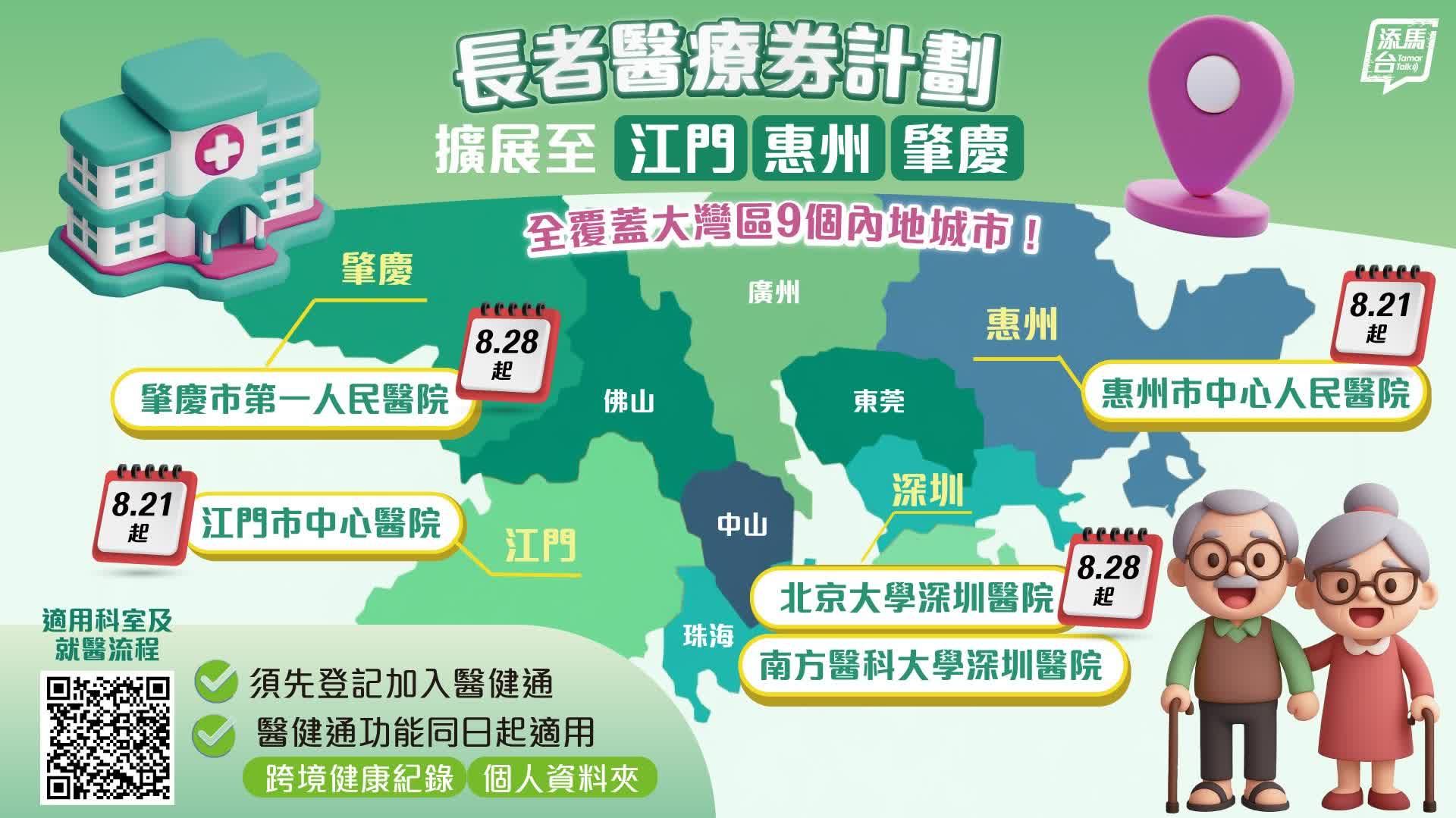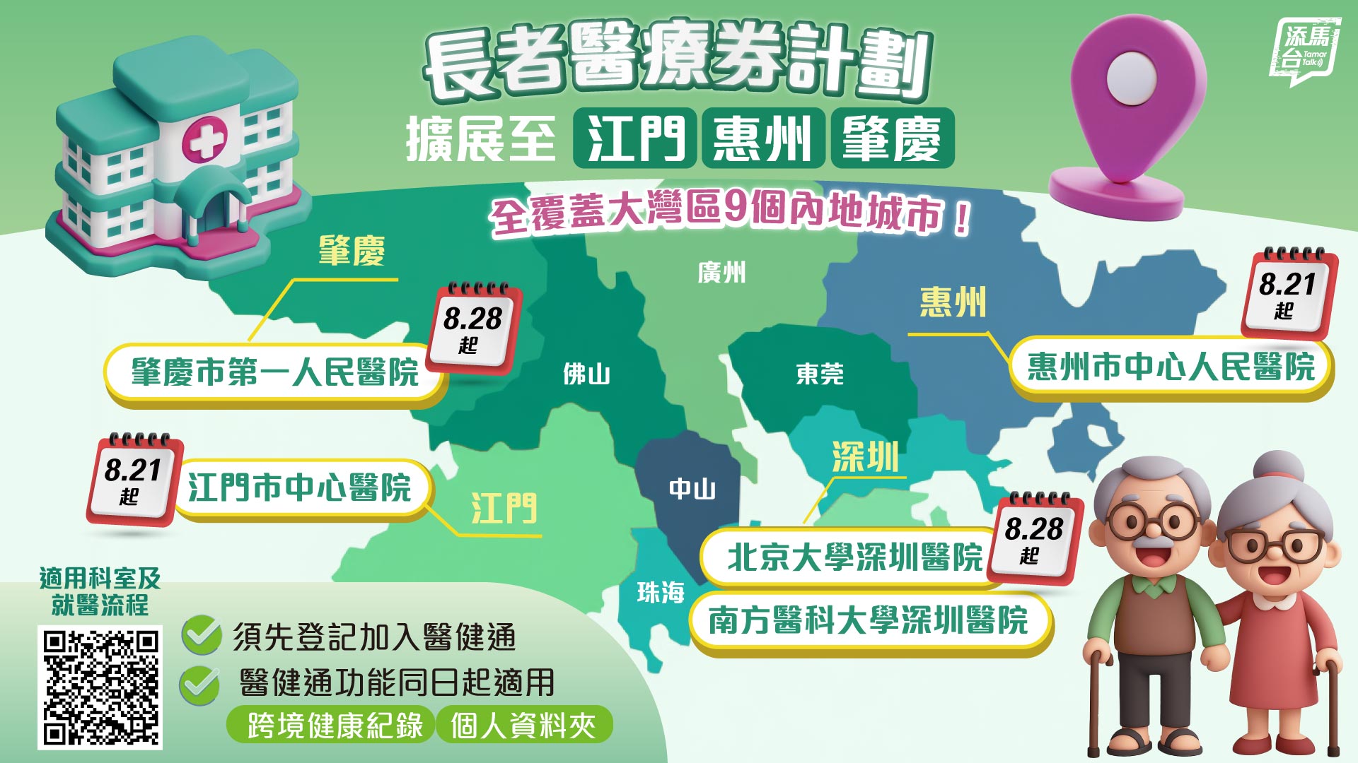 「長者醫療券大灣區試點計劃」本月內再擴展至江門市、惠州市及肇慶市,實現大灣區9個內地城市全覆蓋,並同時於深圳市再增設兩個服務點。合資格香港長者可在新增的5個服務點使用醫療券,支付指定科室的門診醫療護理服務費用,看下圖了解詳情。