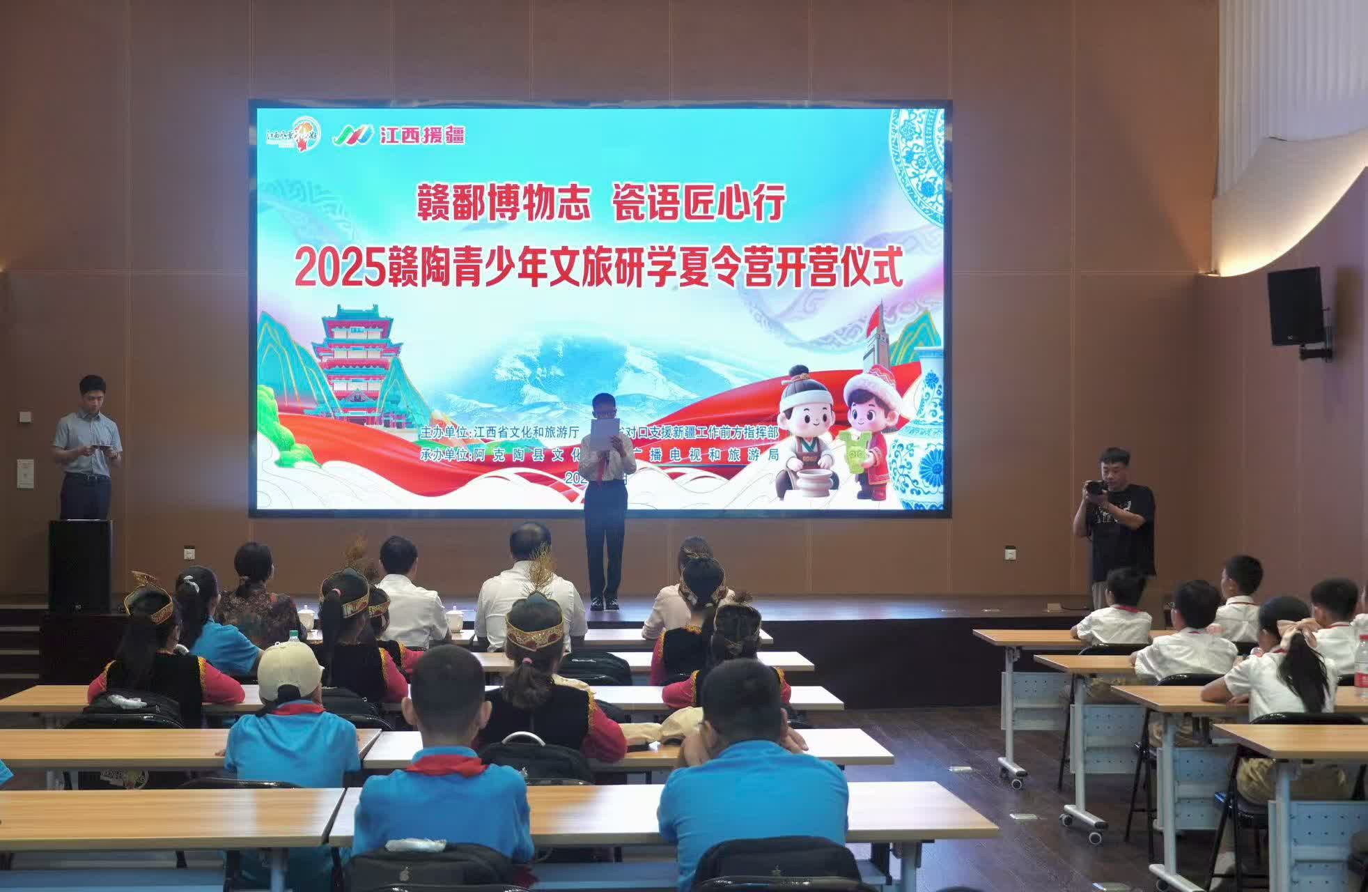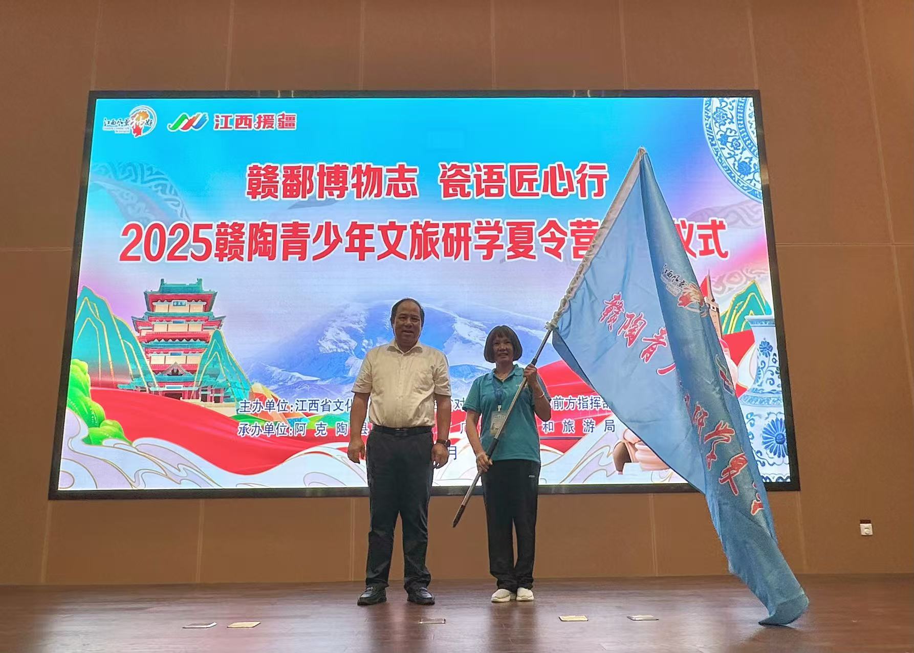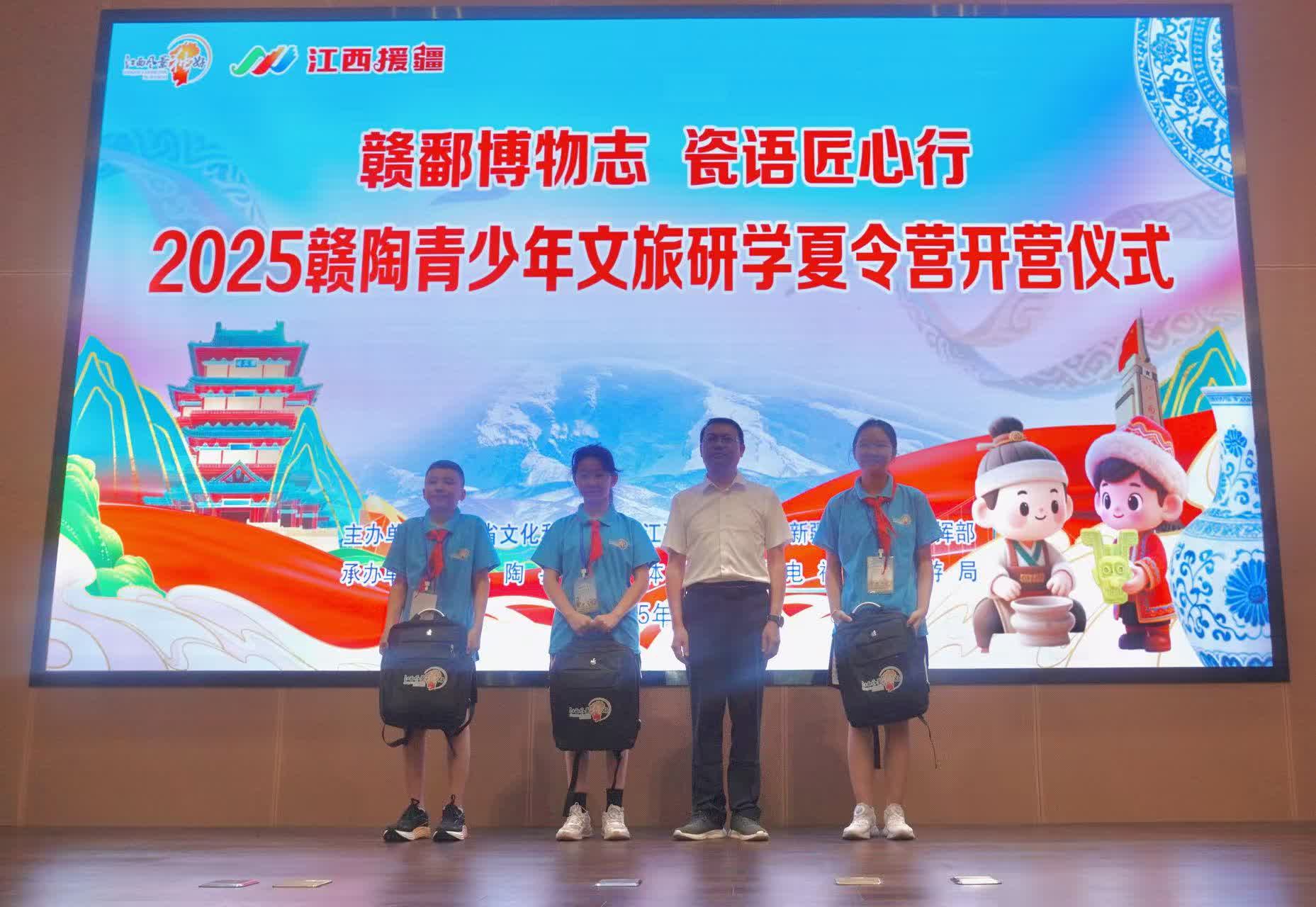 今日(19日),由江西省文化和旅遊廳、江西省對口支援新疆工作前方指揮部共同主辦的2025年贛陶青少年文旅研學夏令營(第二期)在江西省博物館開營。開營儀式上,江西省文旅廳黨組成員、副廳長周建文為夏令營授旗並宣布開營,江西援疆前指黨委委員拱明向夏令營代表贈送書包、文具等物品。