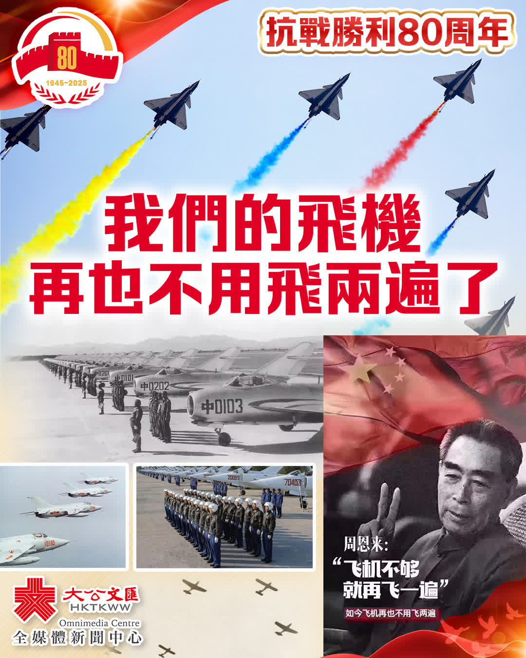 (大公文匯全媒體 實習記者 張夢凡)1949年中華人民共和國開國大典,新中國空軍以僅有的17架飛機亮相,周恩來總理一句「飛機不夠就飛兩遍」道盡初創時期的艱辛。這些飛機型號混雜,部分甚至攜帶實彈飛行,既承擔檢閱任務,又肩負防空警戒,展現了人民空軍在艱難條件下的頑強崛起。從1949年開國大典的17架飛機到2019年國慶閲兵上的168架飛機,從「飛機不夠,再飛一遍」到「優中選優,花式整活」,如今的我們終於可以向周總理回話:「我們的飛機不用飛兩遍了!」