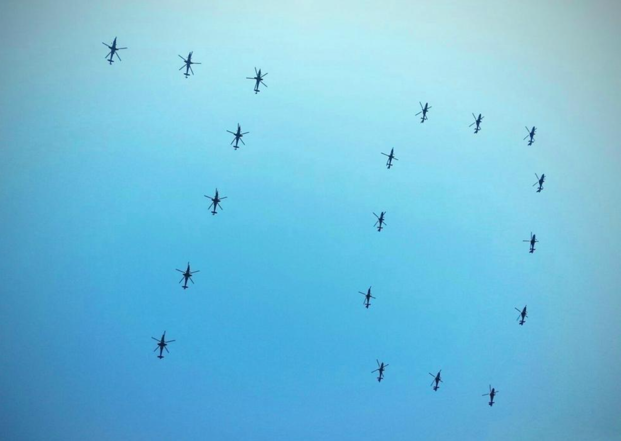 此次閱兵,空中梯隊共有4個。第一梯隊由1架轟6轟炸機領航、另有8架殲教5型飛機分列兩旁,拉出四色彩煙;第二梯隊由18架轟6轟炸機組成,展示戰略轟炸力量;第三梯隊由32架強5強擊機組成,展示戰機的對地攻擊能力;第四梯隊由35架殲7殲擊機組成,展示在空戰中的攔截能力。此次閲兵首次嘗試多機種混合編隊,體現了我國空軍的聯合作戰能力。