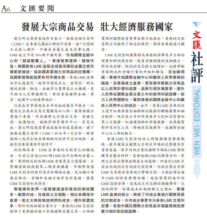港交所主席唐家成昨日表示,倫敦金融交易所(LME)在香港已獲批8個認可倉庫,由7月開始正式投入運作。中國是金屬生產及消費大國,LME成交中有30%與中國有關。作為國際金融中心和「超級聯繫人」,香港發揮優勢、積極作為,將國家與LME這個全球最活躍的金屬交易市場緊密連結,協助國家掌握大宗商品的定價權,為國家發展創造更有利市場生態。香港LME倉庫初步反應熱烈,說明市場需求大、前景好,對本港的倉儲、物流、金融多行業帶來巨大機遇,更可助力人民幣國際化,鞏固香港國際金融、貿易、航運中心的優勢地位。