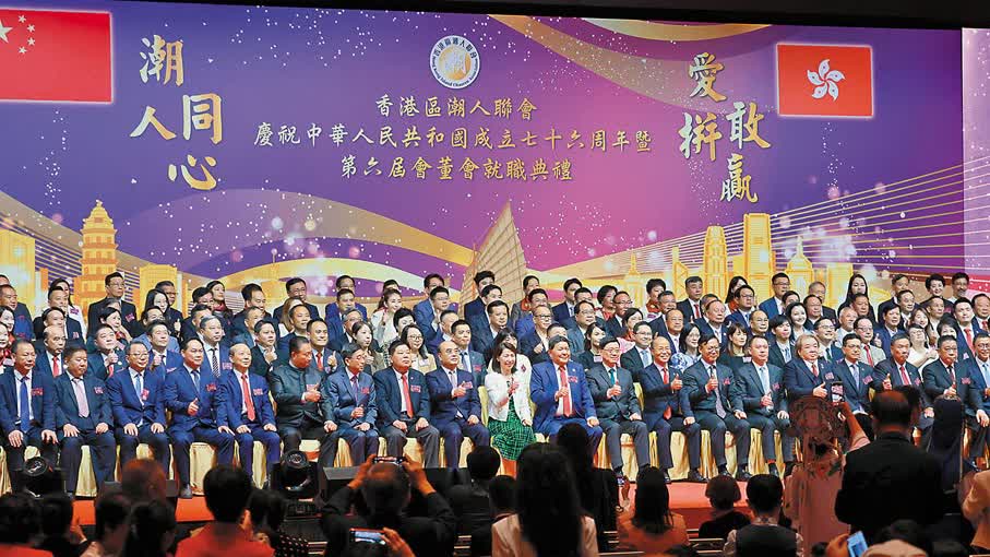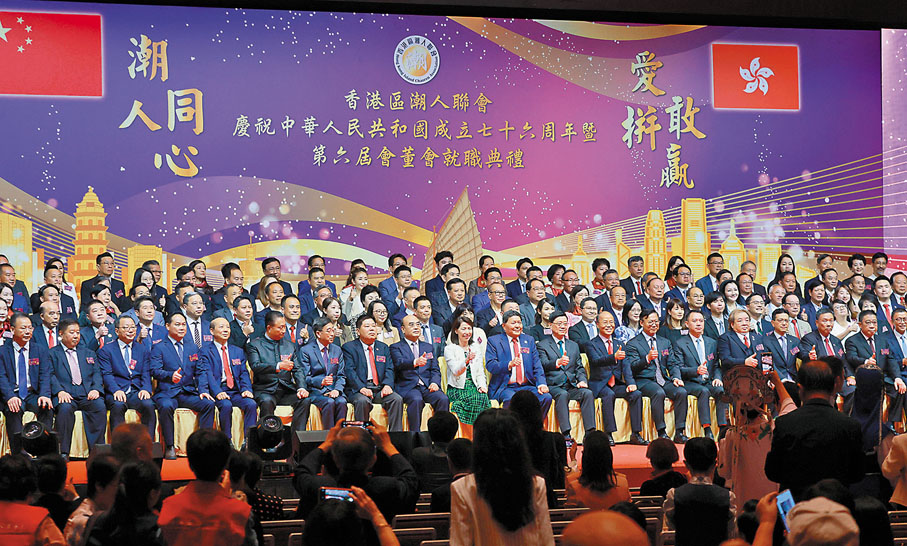 (香港文匯報記者 康敬)香港區潮人聯會慶祝中華人民共和國成立76周年暨第六屆會董會就職典禮昨日在港舉辦,謝曉東膺新屆會長。特區行政長官李家超在活動上致辭表示,第十五屆全運會和殘特奧會首次由粵港澳三地聯合承辦,既體現粵港澳大灣區同心共進的凝聚力量,亦彰顯國家對大灣區協同發展的堅定信心。他希望聯會積極推動會員投入全運會的熱潮,以潮汕好客之道,迎接來港觀看比賽的朋友,為國家、為香港的體育事業貢獻力量。