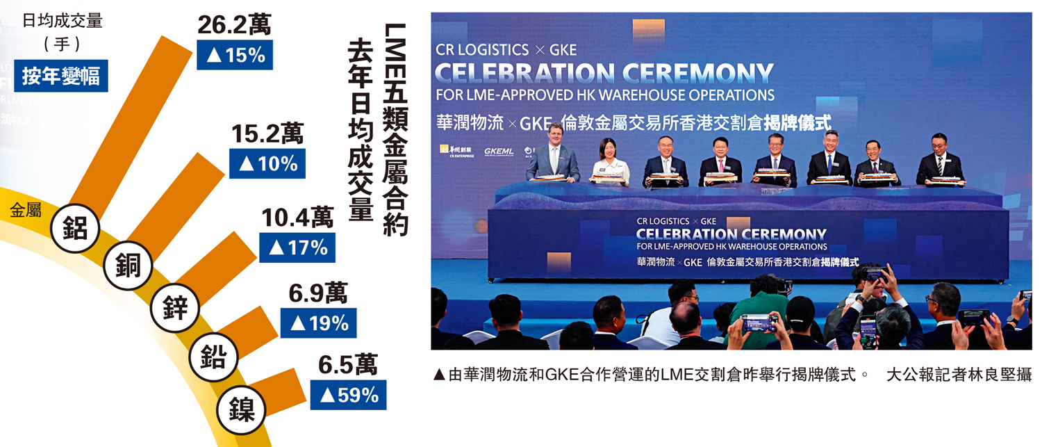 (大公報記者 麥晉瑋)去年行政長官施政報告提出香港建設大宗商品交易生態圈,提升香港金融中心競爭力。港交所(00388)旗下倫敦金屬交易所(LME)在香港的8個核准倉儲設施自7月中正式啟用,作為LME倉庫營運商之一的GKE Metal Logistics與合作夥伴華潤物流,昨日在長沙灣潤發碼頭舉行交割倉揭牌儀式。倉庫投入運作不足一周容量已「爆滿」,並計劃在碼頭擴建第二期倉庫。