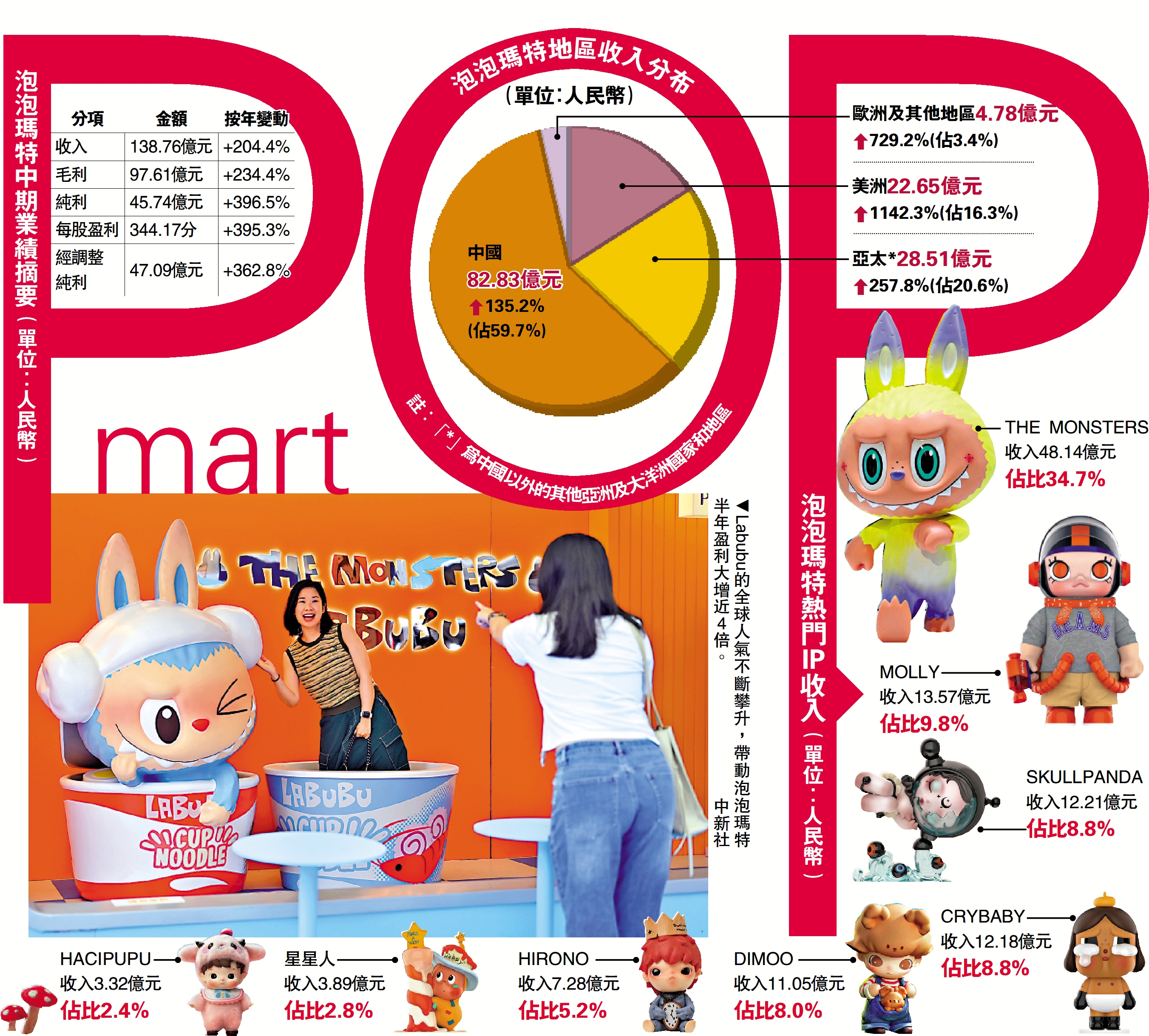 (大公報記者 李樂兒)潮玩龍頭泡泡瑪特(09992)交出一份亮眼「成績單」。截至6月30日止,泡泡瑪特半年盈利46億元(人民幣,下同),大增近4倍,每股基本盈利為344.17分,不派中期息。經調整純利為47.1億元,按年增加3.63倍。其中,Labubu穩坐旗下IP吸金榜首,貢獻總收入比例高達34.7%,此前的主力IP之Molly退居第二,僅佔9.8%。Labubu的強勁銷售表現,推動股價一路走高,年內累計漲幅高達208%。