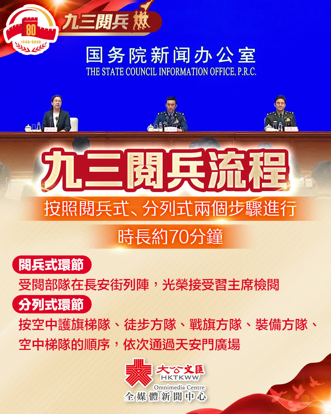 (大公文匯網記者 張寶峰 北京報道)8月20日,國新辦就閱兵準備工作有關情況舉行新聞發布會。閱兵領導小組辦公室副主任、中央軍委聯合參謀部作戰局少將副局長吳澤棵在發布會上表示,閱兵活動按照閱兵式、分列式兩部分舉行,時長約70分鐘。閱兵環節,部隊將光榮接受習近平主席檢閱。這次閱兵設45個方隊。
