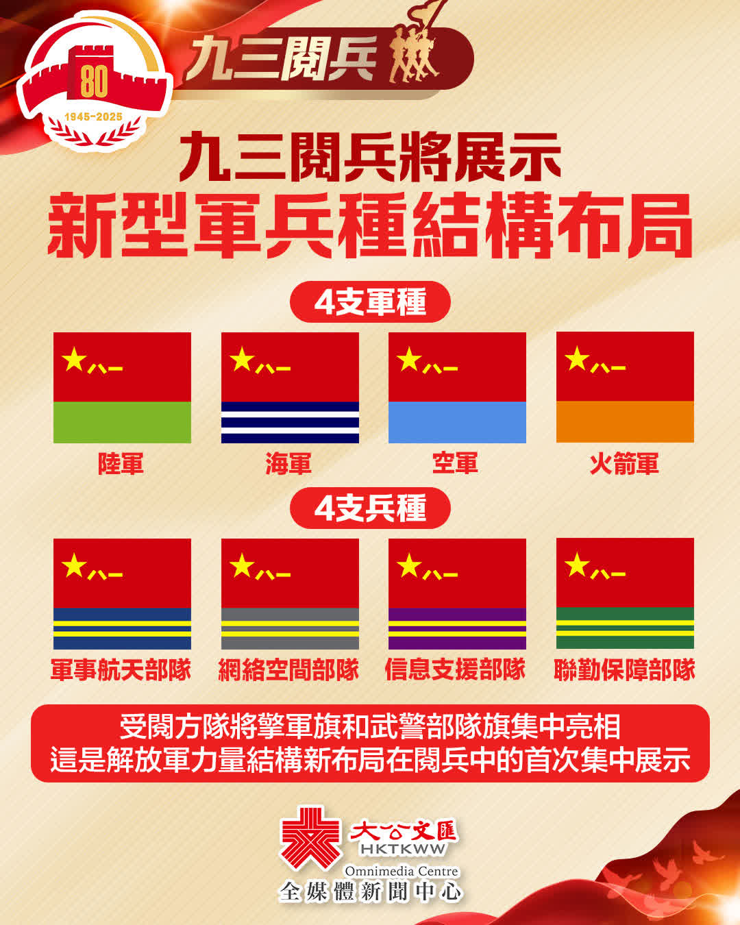 相關負責人介紹:今年八一前夕,習主席簽署命令,發布4支兵種軍旗旗面式樣,標誌着我軍構建起以八一軍旗為主體、軍兵種軍旗為補充的新時代人民軍隊軍旗體系。這次閱兵,在黨旗、國旗、軍旗引領下,受閱方隊將擎軍旗和武警部隊旗集中亮相,這是我軍力量結構新布局在閱兵中的首次集中展示。