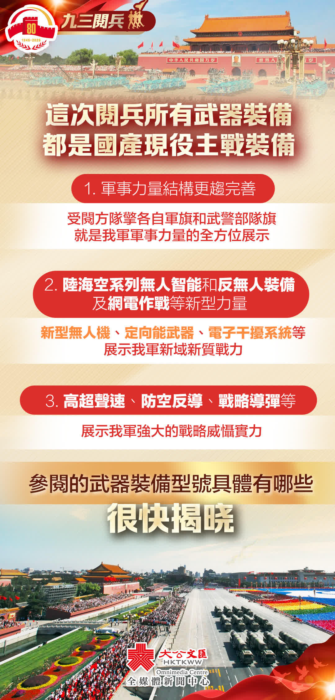 閱兵領導小組辦公室副主任、中央軍委聯合參謀部作戰局少將副局長吳澤棵回應表示,這次閱兵,所有受閱武器裝備都是國產現役主戰裝備,是繼2019年國慶大閱兵後我軍新一代武器裝備的集中亮相。主要有這麼幾個特點:一個是,以新型四代裝備為主體,比如新型坦克、艦載機、殲擊機等,按作戰模塊進行編組,展示我軍體系作戰能力。另一個是,遴選陸上、海上、空中系列無人智能和反無人裝備,以及網電作戰等新型力量受閱,比如新型無人機、定向能武器、電子干擾系統等,展示我軍新域新質戰力。再一個是,集中亮相一批高超聲速、防空反導、戰略導彈等先進裝備,展示我軍強大的戰略威懾實力。可以說,這次受閱的武器裝備信息化、智能化程度都比較高,充分體現我軍適應科技發展和戰爭形態演變、打贏未來戰爭的強大能力。至於參閱的武器裝備型號具體有哪些,請大家耐心等待,很快就會知曉。