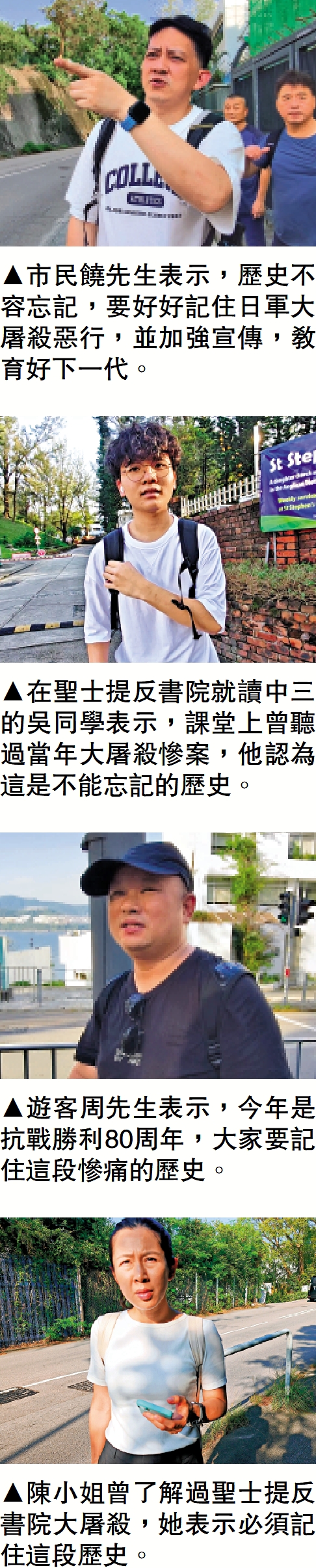 在聖士提反書院外,有學生和市民表示知道事件。陳小姐說,以前不太清楚,但參觀博物館的抗戰展覽後知道這場大屠殺,日軍殘暴無比,身為香港人絕不能忘這段歷史。