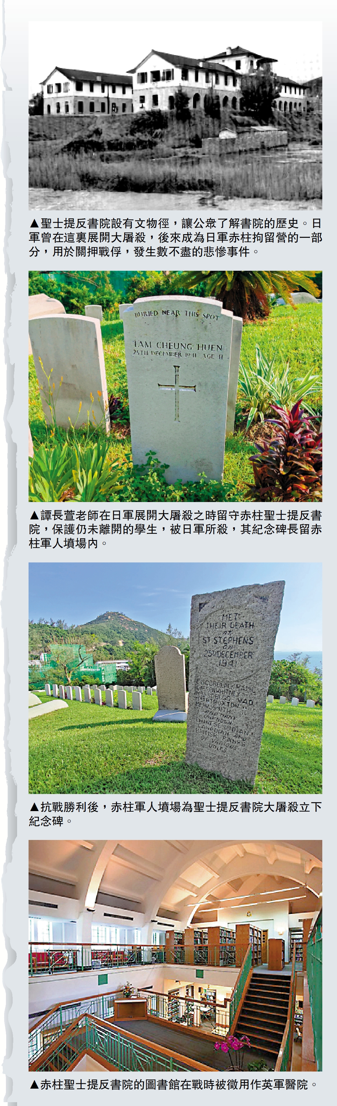 (大公報記者 盛德文 <圖、文> 許棹傑 <視頻> )1941年12月24日,日軍進攻赤柱。12月25日,港督楊慕琦宣布投降,香港淪陷。12月26日,退守赤柱炮台的英軍棄械投降。日軍攻打及佔領香港期間,犯下種種令人髮指的罪行,香港恍如煉獄。聖士提反書院發生的大屠殺更是慘絕人寰,被屠殺的英軍傷員、醫護、教職員及平民多達170人。日軍姦殺大批醫護,當中不少人被虐殺肢解。 視頻> 圖、文>