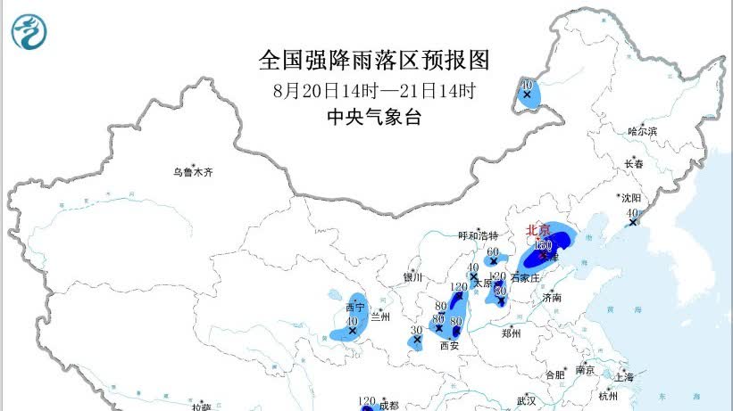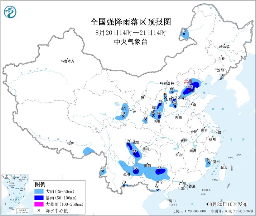 預計,8月20日08時至21日08時,遼寧東部、吉林東南部、青海東部、甘肅南部、陝西北部、山西、北京東南部、天津、河北中南部和東北部、四川盆地西南部、貴州西部和南部、雲南北部和東南部、福建中東部、廣西北部、廣東西北部等地的部分地區有大到暴雨,其中,河北中部等地局地有大暴雨(100~130毫米)。上述部分地區伴有短時強降水(最大小時降雨量20~50毫米,局地可超過60毫米),局地有雷暴大風等強對流天氣。