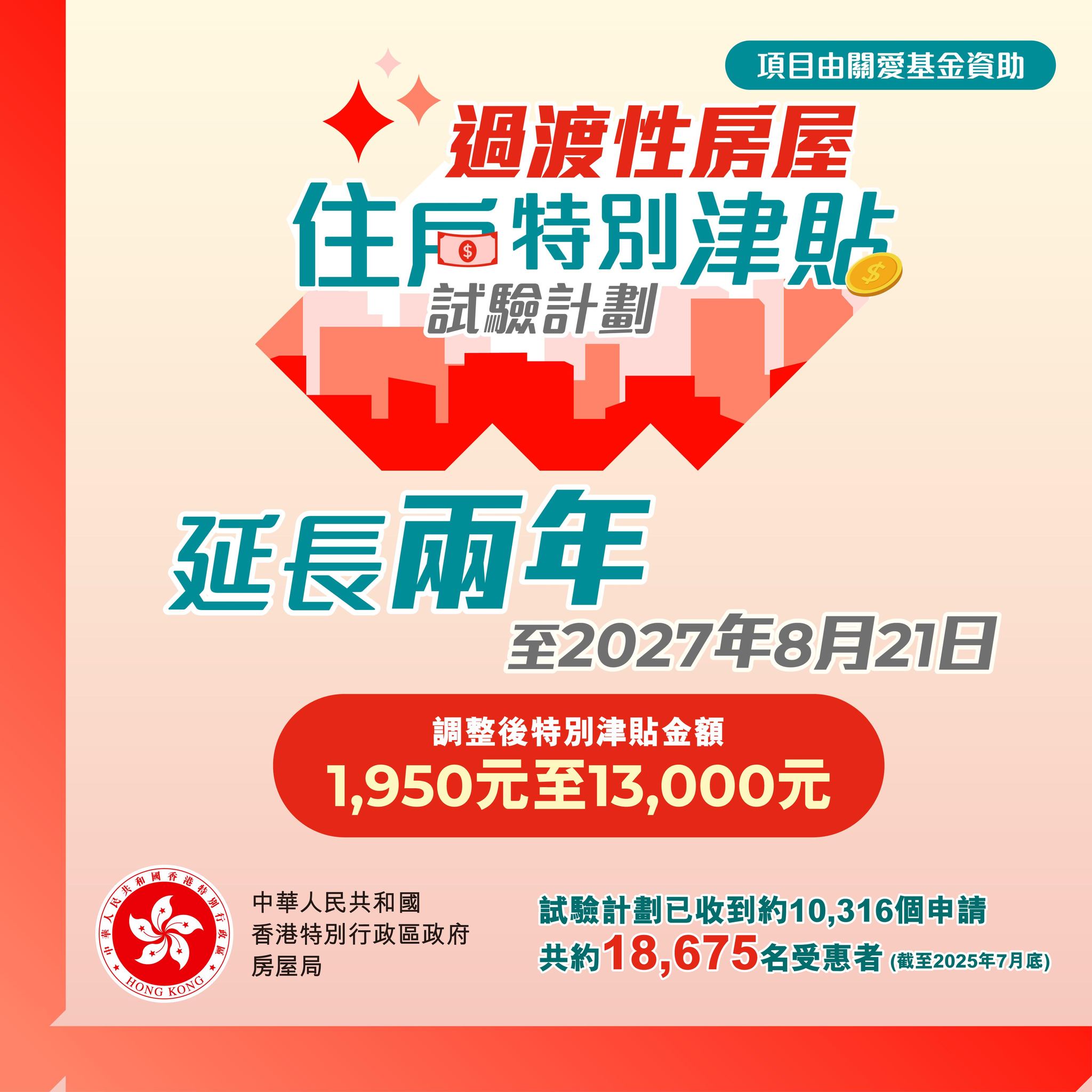 房屋局局長何永賢今日(20日)宣布,試驗計劃會延長兩年至2027年8月21日,繼續為過渡性房屋甲類和乙類新住戶提供一次性的特別津貼,讓他們用於搬遷、添置傢俱電器、孩子轉校和重新建立社區網絡等,減輕他們的開支壓力。