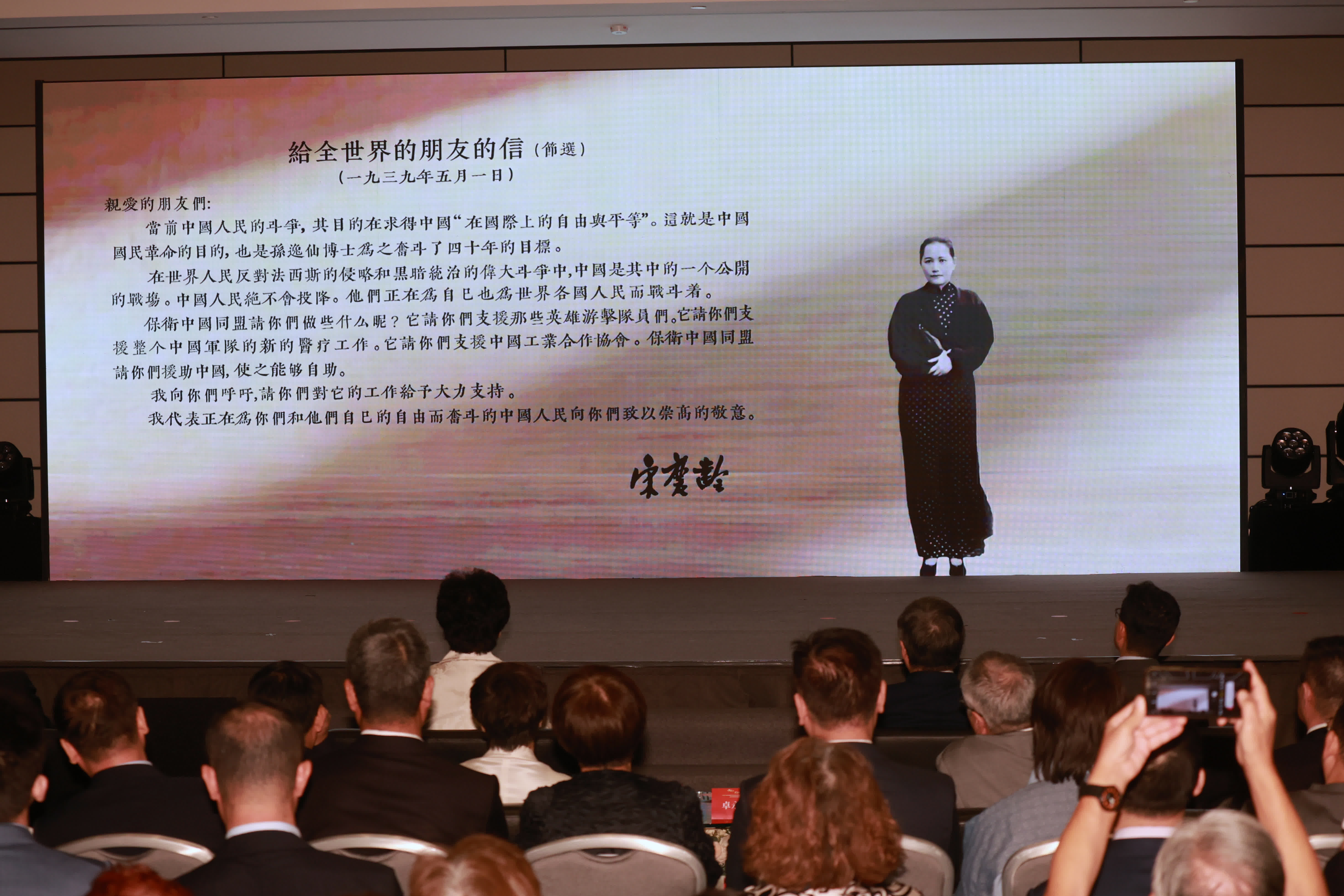 中國福利會亦在開幕式中,通過AI技術還原的宋慶齡的聲音,宣讀她在1939年5月1日發表的《給全世界的朋友的信》,向世界揭露法西斯侵略暴行,呼籲國際正義援助,其堅定信念與深沉愛國情直抵人心。保衛中國同盟成員陳君葆的女婿、陳君葆著作主編謝榮滾指出,緬懷宋慶齡及保衛中國同盟成員當年懷着滿腔愛國熱情、盡忠職守、全力以赴為抗戰付出的巨大辛勞。