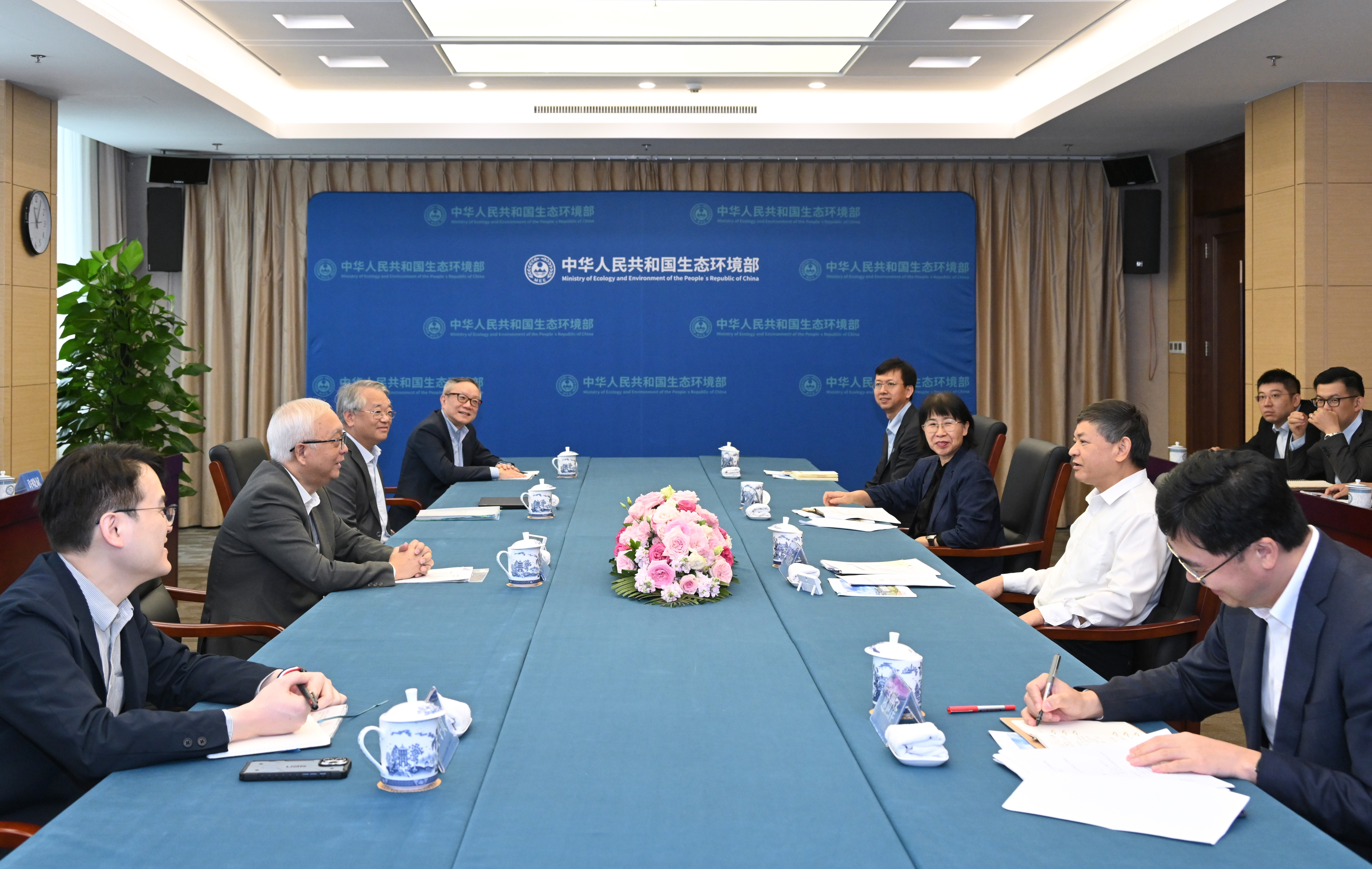 謝展寰上午首先到訪國家生態環境部,與部長黃潤秋會面,就環境及生態局在保護環境方面的工作,包括減碳進程、推動綠色能源轉型、發展綠色低碳產業、減廢回收成效、發展轉廢為能設施、自然及生態保育、空氣質量和整體水環境等,作深入交流。