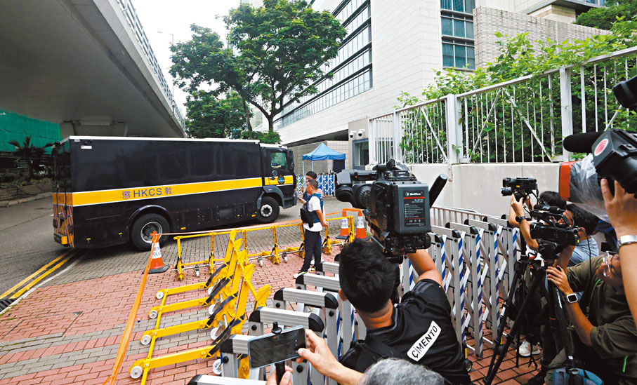 本案由3名香港國安法指定法官杜麗冰、李素蘭及李運騰審理。昨早約10時,黎智英戴着動態心電圖監測儀,在3名懲教人員押解下進入法庭,隨即隔着玻璃向律師團隊作指示,雙方「咬耳仔」約一分多鐘才停止交流。黎智英繼續戴着黑色粗框眼鏡,身穿米白色風褸,淺卡其色長褲出庭,他多次向旁聽席揮手,又雙手合十、抱拳等,全程多次變換姿勢,不時緊抿嘴唇,側頭摸耳。