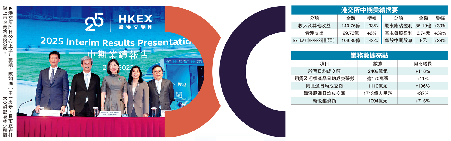 港交所期內主要業務收入129.54億元,升33.68%,反映現貨及股票期權市場成交量創歷來半年度新高。上半年證券市場平均每日成交金額2402億元,按年上升1.18倍,期貨及期權產品的平均每日成交合約張數超過170萬張,升11%。滬深港通成交額方面,北向及南向均創歷年的半年度新高。債券通北向通平均每日成交金額459億元,升3%也創下新高。