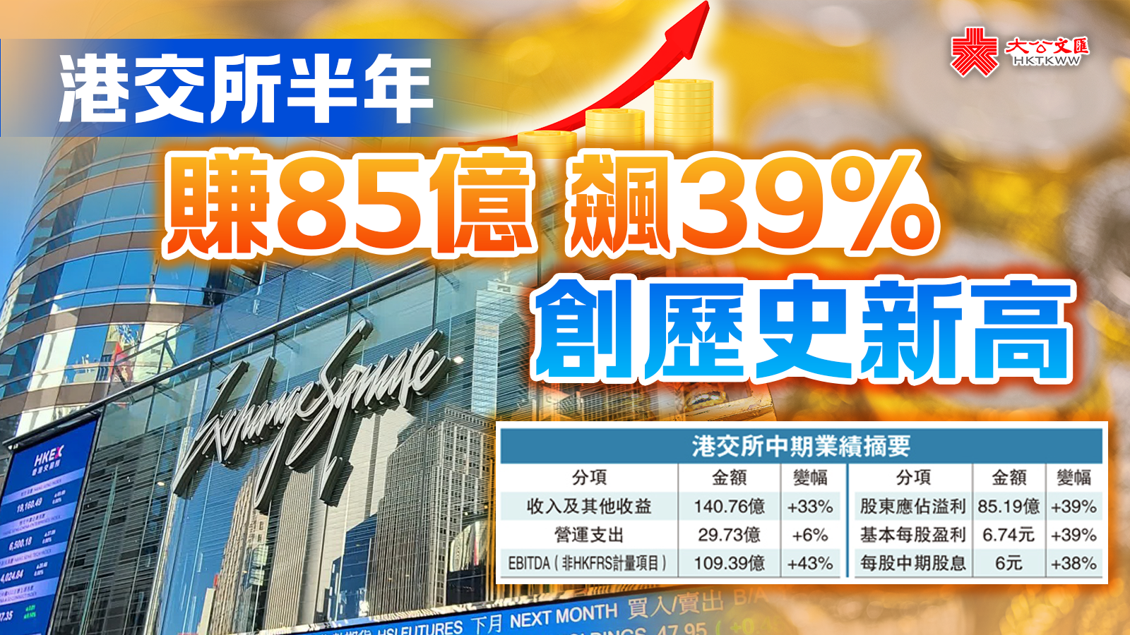 (大公報 記者 麥晉瑋)受惠港股市場成交暢旺及新股市場持續熾熱,港交所(00388)上半年交出亮麗的業績,股東應佔溢利85.19億元,大升39%;收入及其他收益140.76億元,按年升33%,收入及溢利均創下歷來半年度新高。