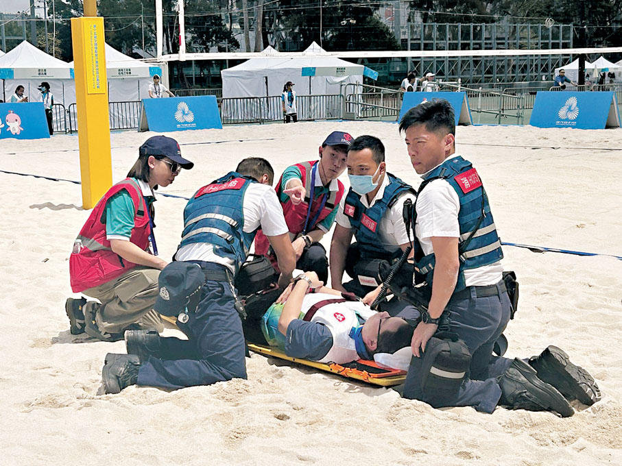 醫院管理局自去年11月起即參與各項賽事的測試賽,以模擬全運會正式賽事舉行的情況,並與其他相關部門進行交流會議,以改善在測試項目中發現的問題。律敦治醫院急症科部門運作經理程清霞透露,在沙灘排球測試賽中,醫護人員需要克服戶外救援的挑戰,並且要了解賽事資訊以及規則,「由於工作場地並非本身熟悉的醫院,我們要在沙地上拯救傷者,並且研究最佳救援路線,這些測試賽提供了實戰的經驗。」