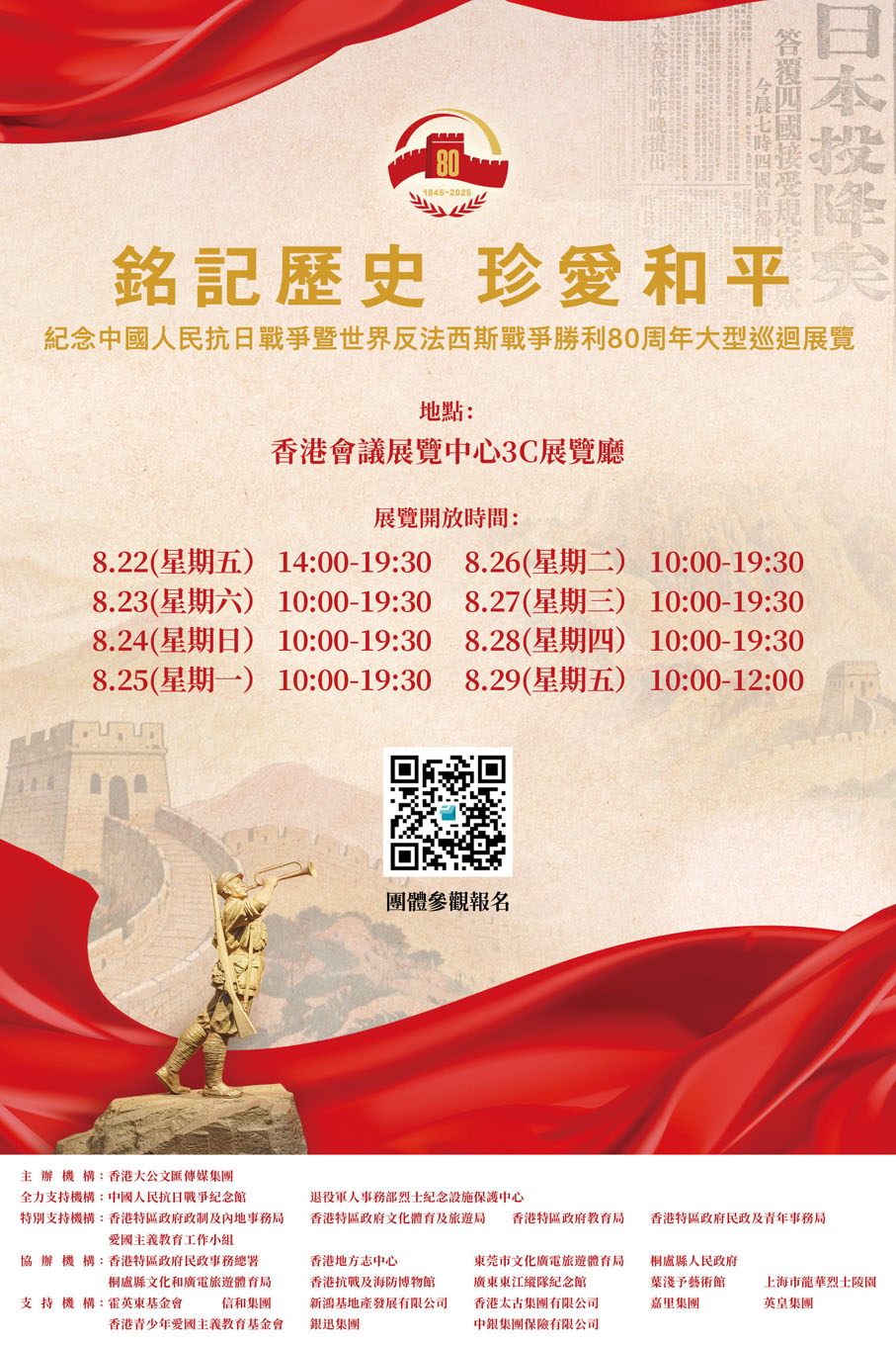 由大公文匯傳媒集團主辦的「銘記歷史 珍愛和平——紀念中國人民抗日戰爭暨世界反法西斯戰爭勝利80周年大型巡迴展覽」將於8月22日至8月29日假香港會議展覽中心3C展廳舉辦。