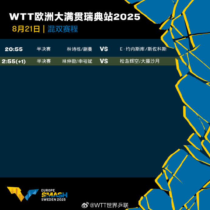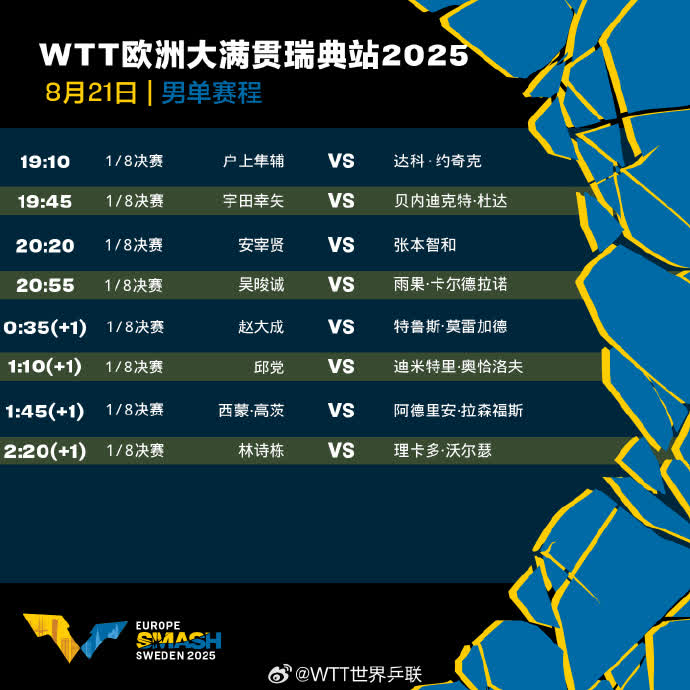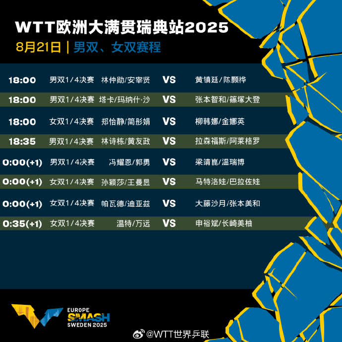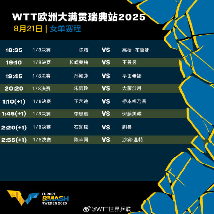 大公文匯全媒體報道,2025年WTT歐洲大滿貫瑞典站8月21日賽程出爐,比賽進入真正的白熱化階段。今日,女子單打八分之一決賽將上演三場「中日對決」,國乒男單僅剩一人。孫穎莎對戰早田希娜,王曼昱對戰長崎美袖,王藝迪對戰橋本帆乃香;林詩棟對壘德國小將沃爾瑟。