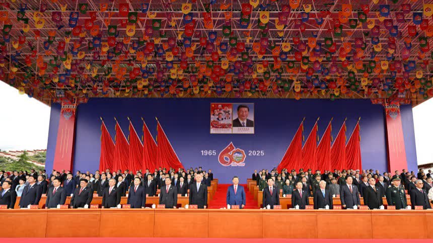 古城拉薩彩旗飄揚,處處洋溢着節日的氛圍。雄偉的布達拉宮下,搭建起藏式風格的大會主席台。主席台上方中華人民共和國國徽和「西藏自治區成立60周年慶祝大會」橫幅十分醒目,背景牆上懸掛着大慶會徽和「1965」「2025」字樣,10面紅旗分列兩側。主席台對面的布達拉宮廣場上,身着節日盛裝的各族群眾從四面八方匯聚到這裏,手中揮動着紅旗,匯聚成一片歡樂的海洋。