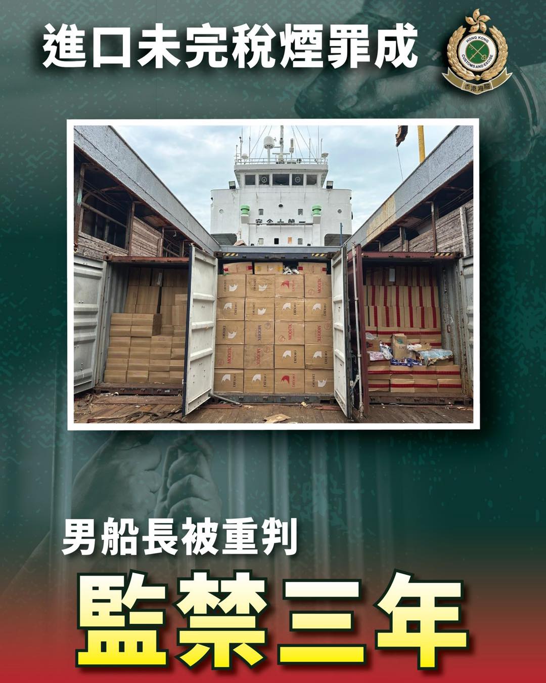 首先,香港海關於二○二四年七月二十四日,在南丫島對開海面截查一艘貨船,並在貨船上檢獲三千零四十萬支未完稅香煙,估計市值約港幣一億三千七百萬元,應課稅值約港幣一億零五十萬元。該名四十九歲的男船長因進口未完稅香煙,違反香港法例《進出口條例》被捕,並於八月十三日在區域法院被判罪成及監禁三年。