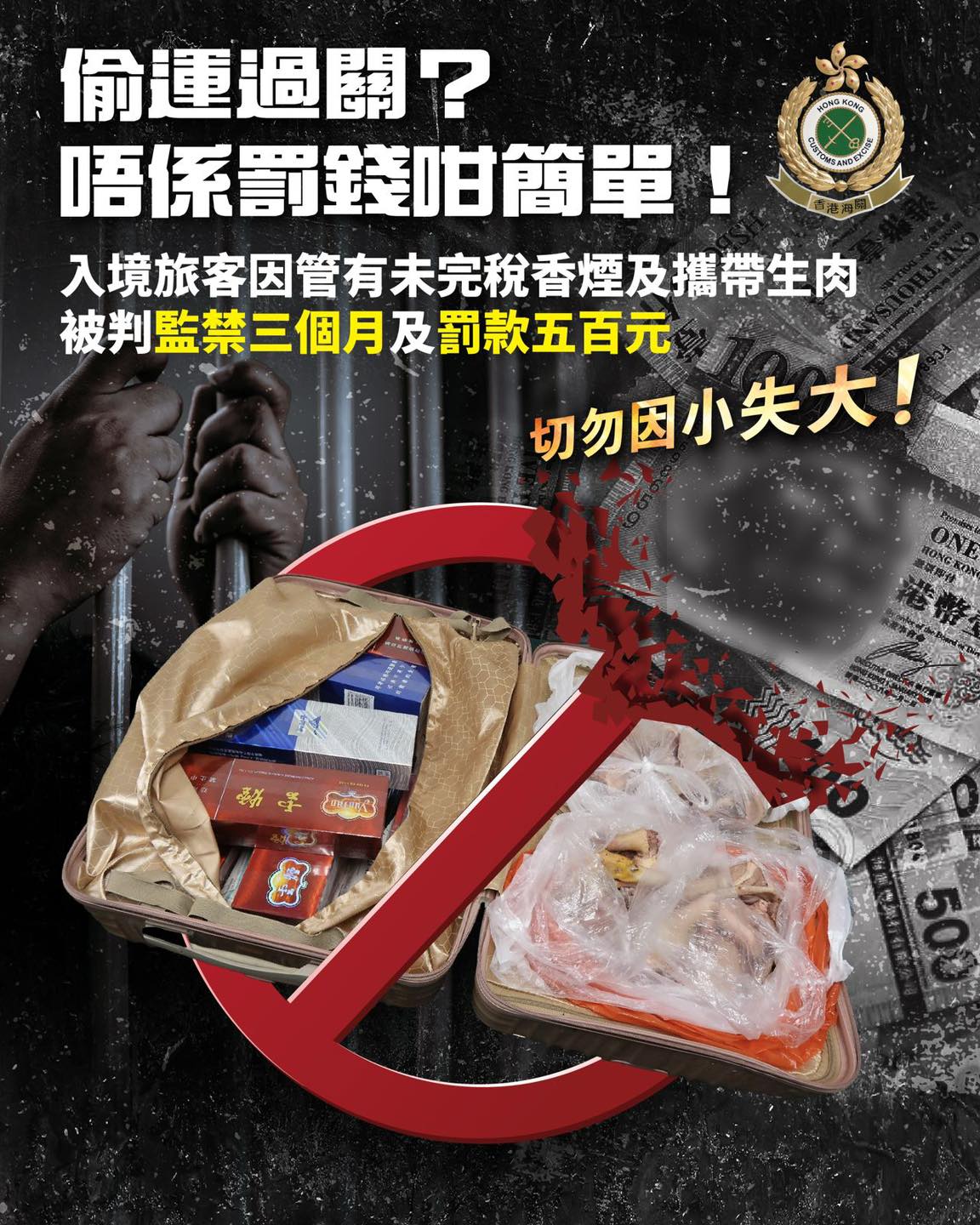 根據香港法例《進出口條例》,任何人輸入或輸出未列艙單貨物,或者進口另類吸煙產品即屬違法,一經定罪,最高可被判罰款港幣二百萬元及監禁七年。此外,根據香港法例《進口野味、肉類、家禽及蛋類規例》(第132AK章),凡任何人攜帶野味、肉類、家禽或蛋類入境而沒有原產地發證實體簽發的衞生證明書及/或沒有食物環境衞生署的事先書面批准,均屬違法。違例者一經定罪,可被罰款港幣五萬元及監禁六個月。