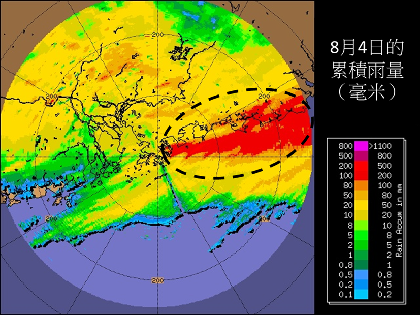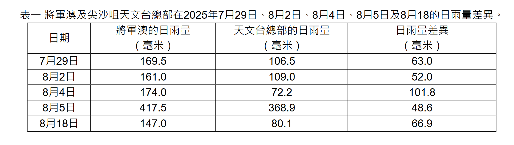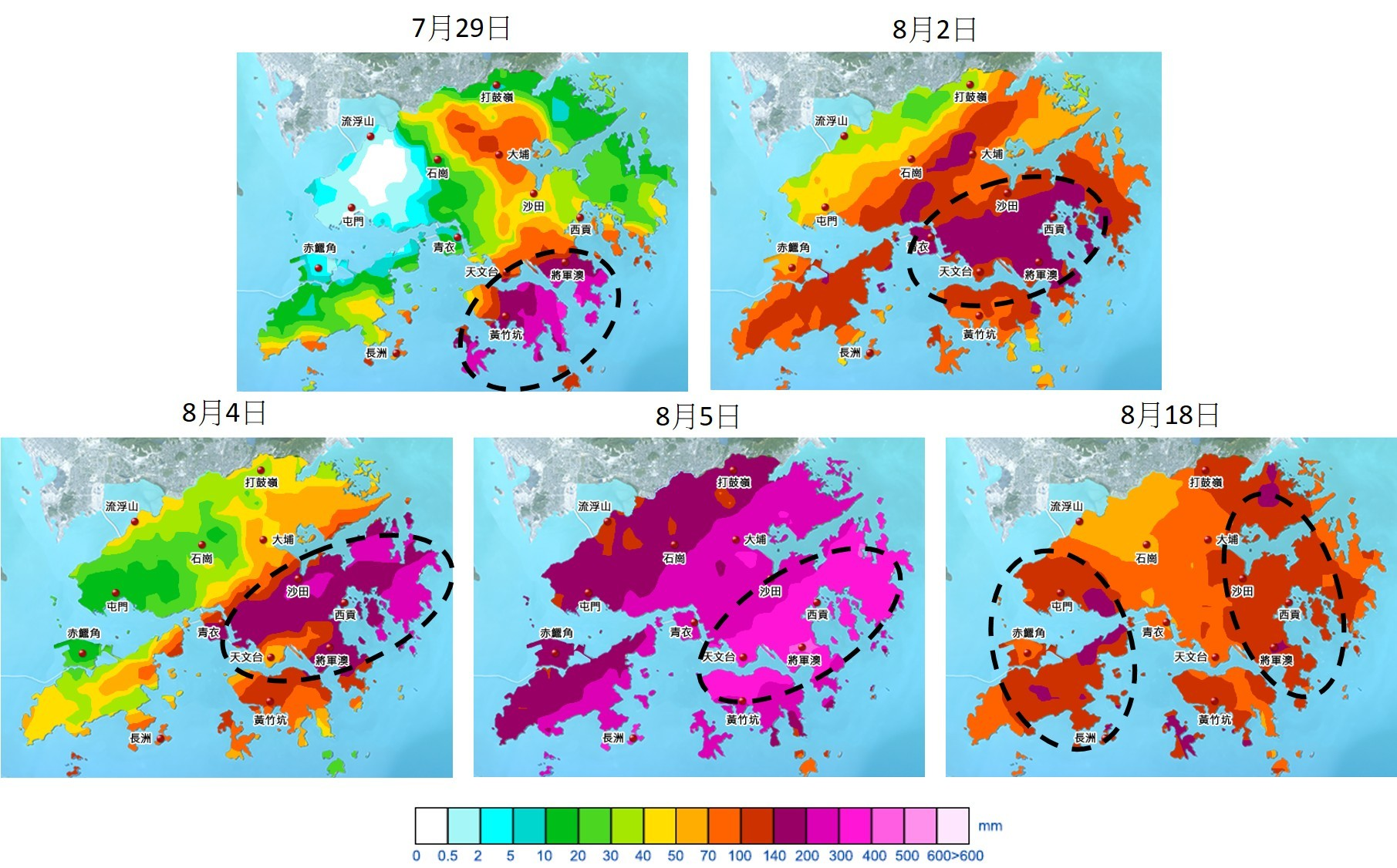 文章解釋,慈雲山、大老山及大帽山附近地區因地勢較高,氣候上雨量一般較香港其他地方高。另一方面,雖然九龍東及將軍澳區的長期平均雨量與尖沙咀天文台總部相若,但今年這兩區雨量明顯較多,相信主因是與7月尾至8月中連場暴雨的分布有關。當中7月29日、8月2日、8月4日、8月5日及8月18日較大雨的區域大多位於香港東南部(包括九龍東、將軍澳及港島東)。在這幾場暴雨事件中,將軍澳的雨量均較尖沙咀天文台總部多約50至100毫米。以8月4日的暴雨為例,根據天文台初步分析,香港以東當時出現低空急流,配合背景的活躍西南季候風,有利強降雨區的發展。