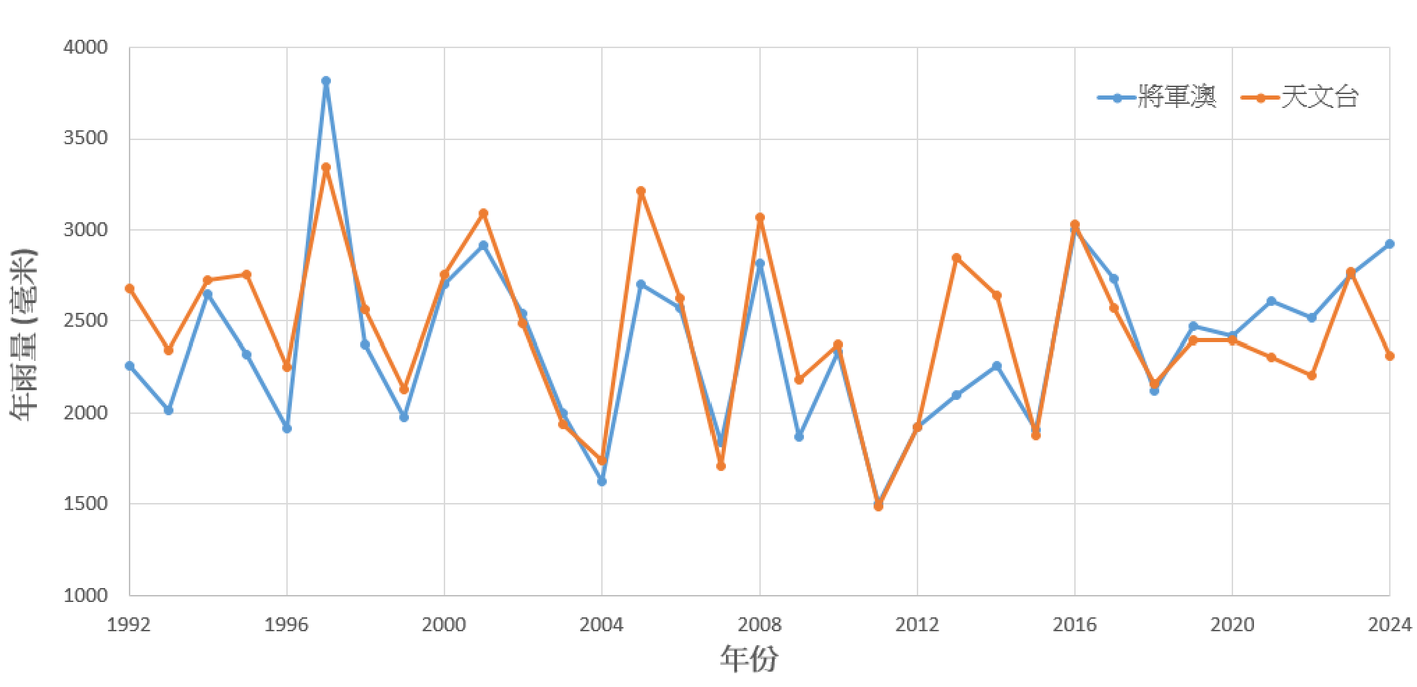 暴雨發展有很大隨機性,雖然有時本港普遍地區出現暴雨,但不同地區的雨量可以差異很大,所以本港各區每年的雨量亦有明顯差異。再以將軍澳和天文台的年雨量為例,1992年至2024年期間,有些年份將軍澳的總雨量較天文台高,有些年份則相反。