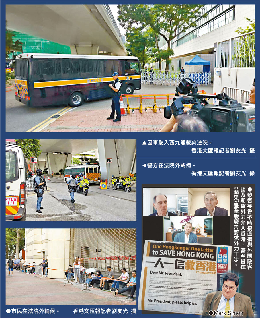 本案由3名香港國安法指定法官杜麗冰、李素蘭及李運騰審理。昨早約10時,黎智英戴着動態心電圖監測儀,在3名懲教人員押解下進入法庭。他繼續戴着黑色粗框眼鏡,身穿米白色風褸,淺卡其色長褲出庭,在坐下前雙手合十、向觀眾席點頭、揮手,又持續與旁聽席的家屬點頭、口語交流及微笑。