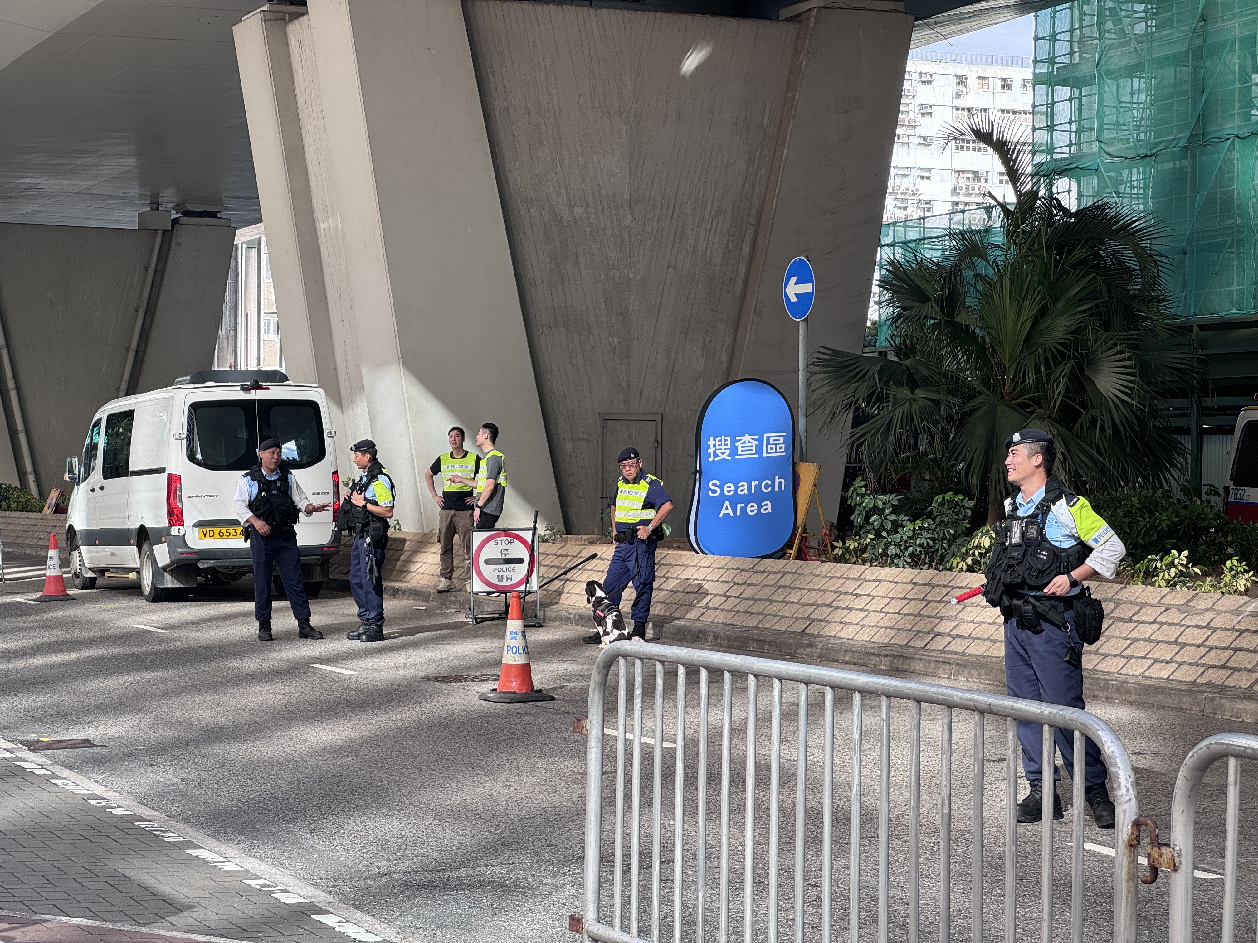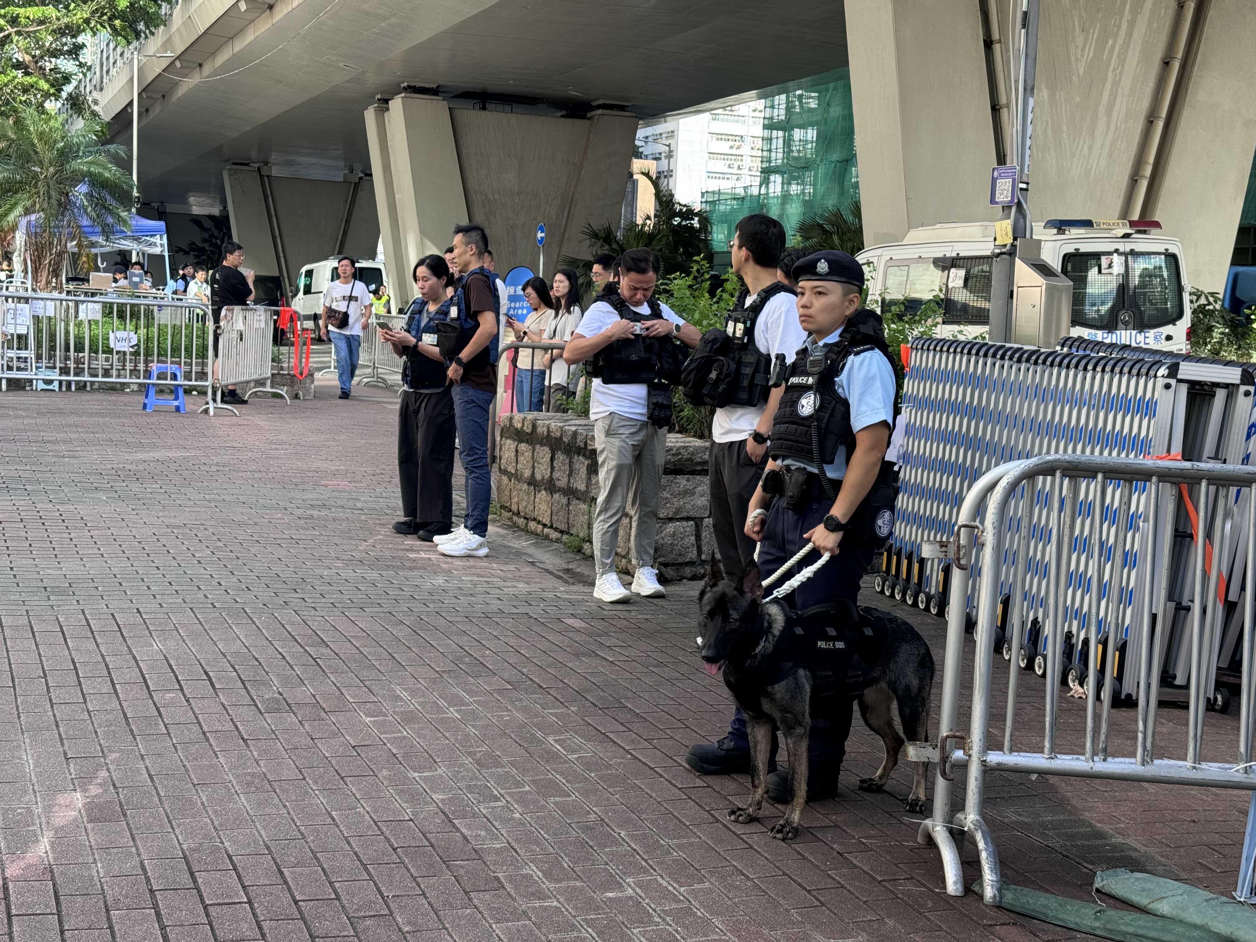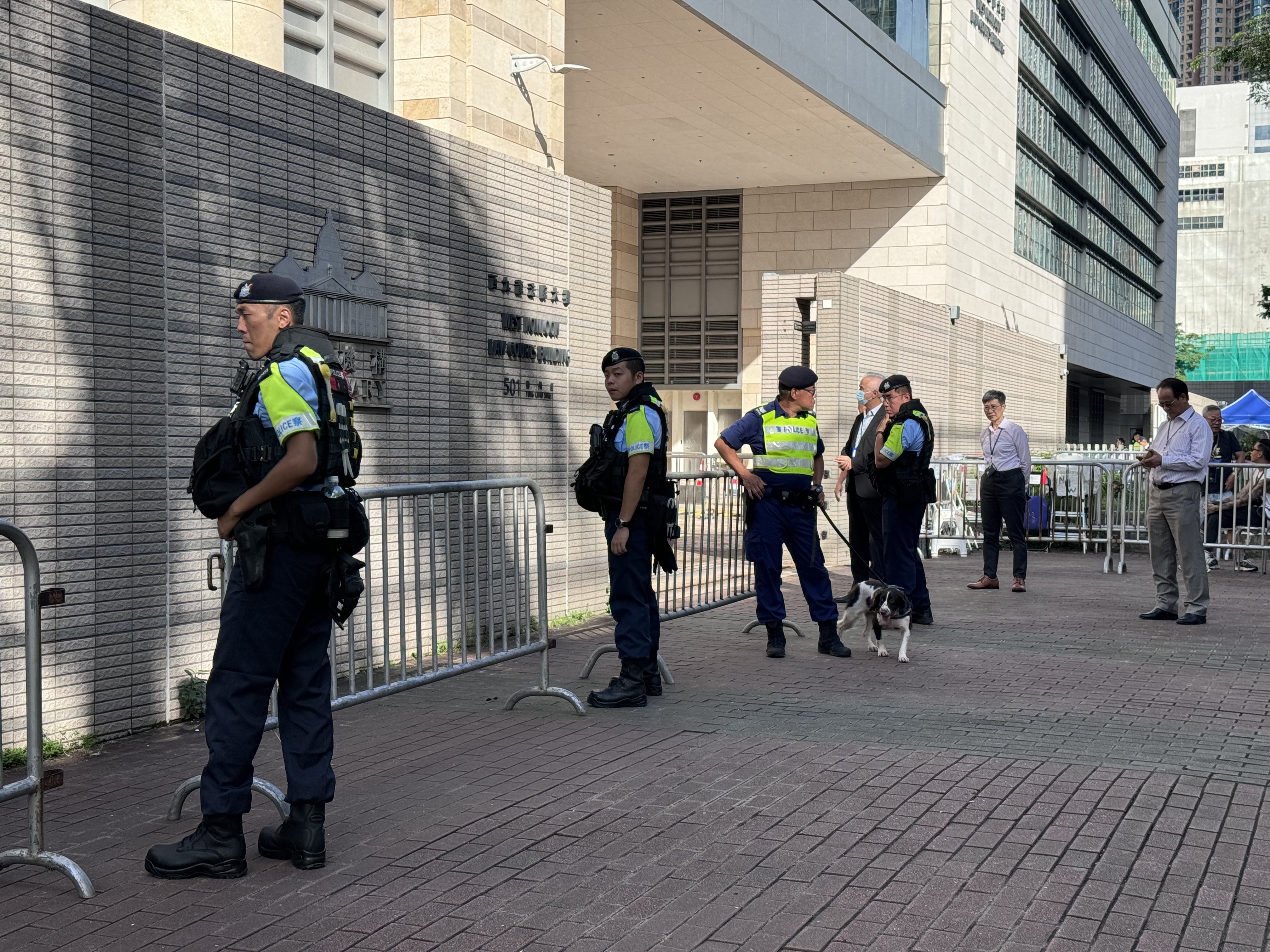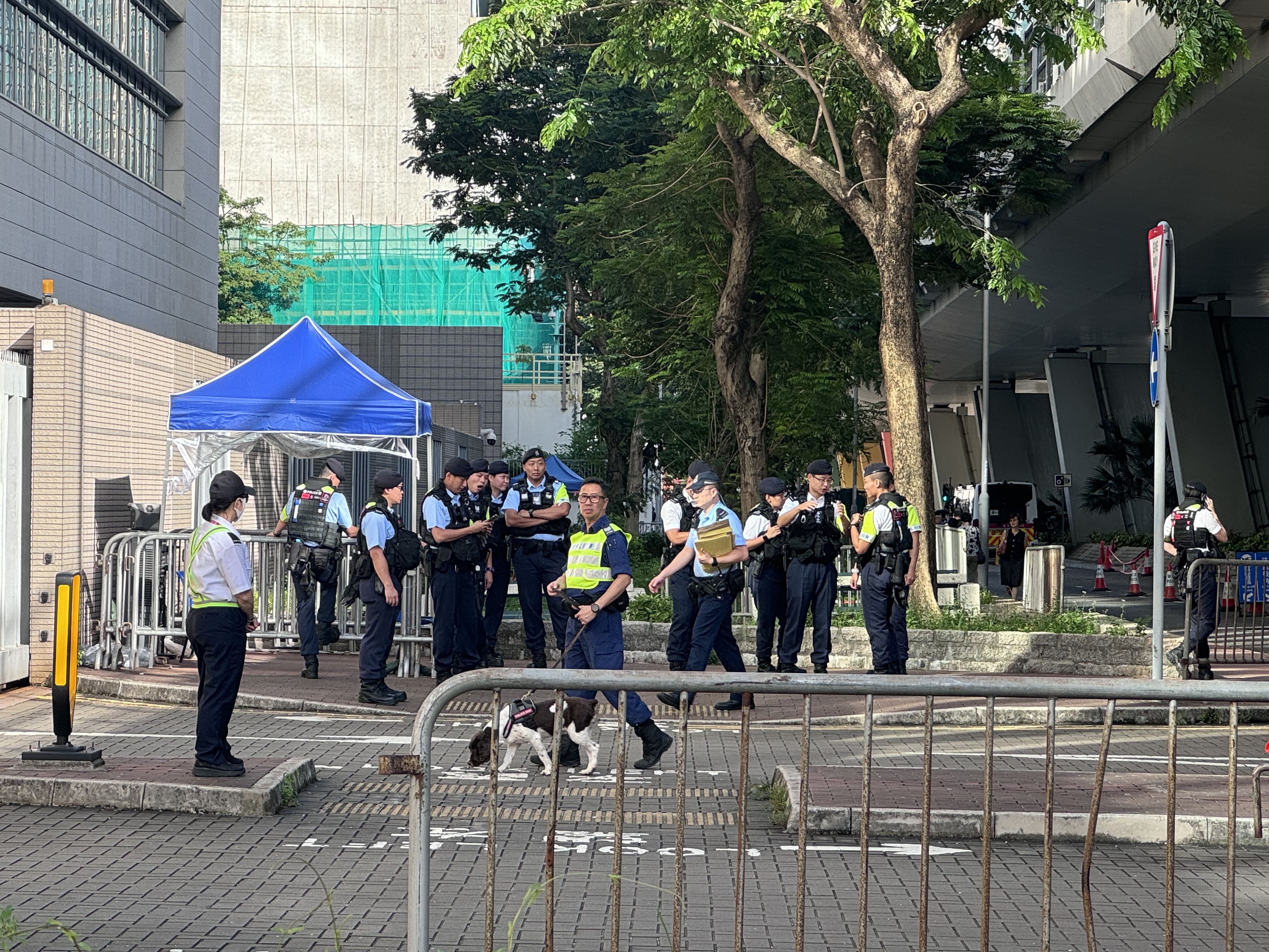 今早,西九龍裁判法院外保安措施顯著加強,至少十多輛警車駐守戒備,數十名穿着防刺戰術背心的警員在場巡邏,有警犬協助執勤搜索。同時,警方在法院外圍設置警崗,對可疑車輛進行搜查,確保沒有危險物品。