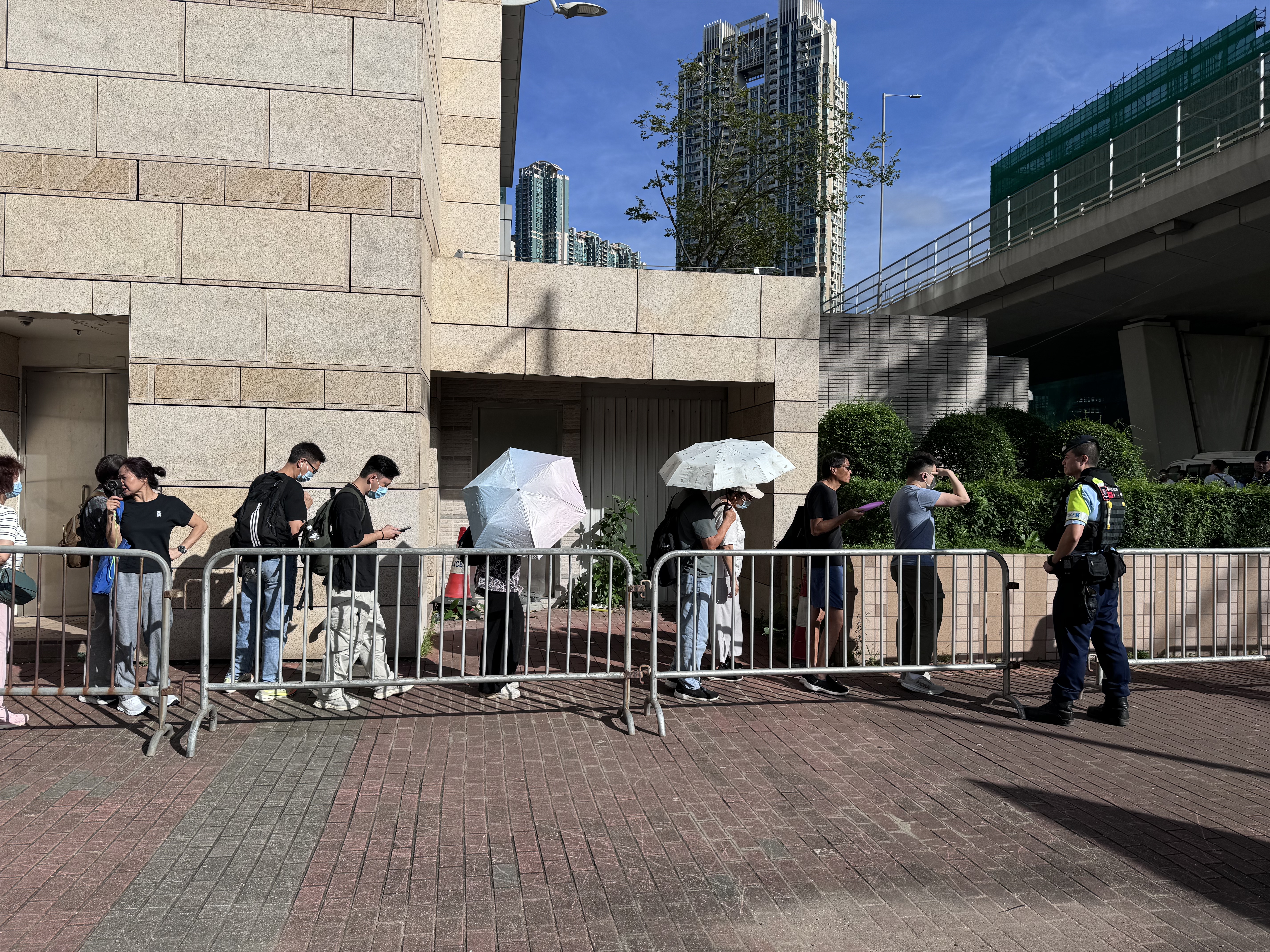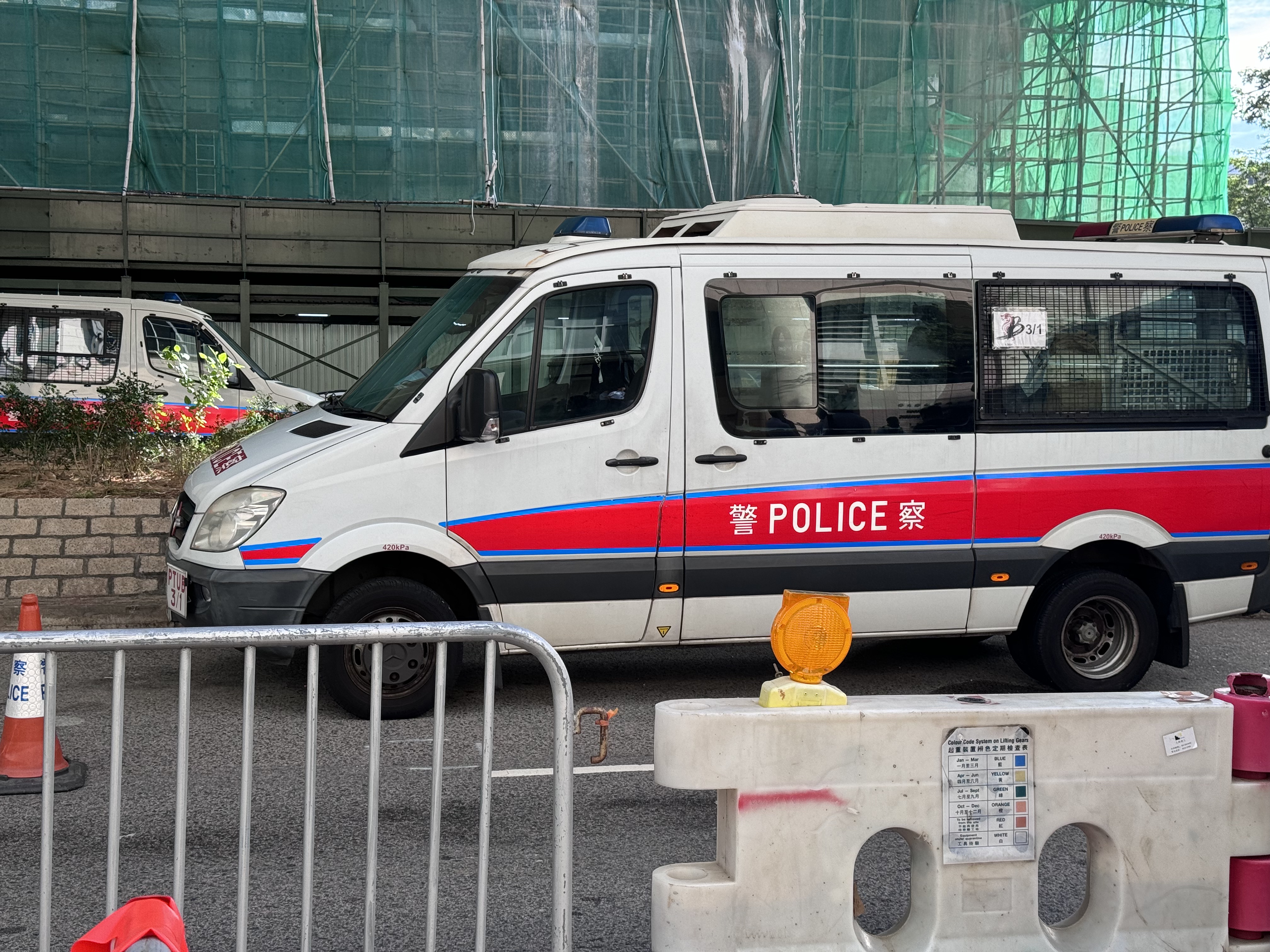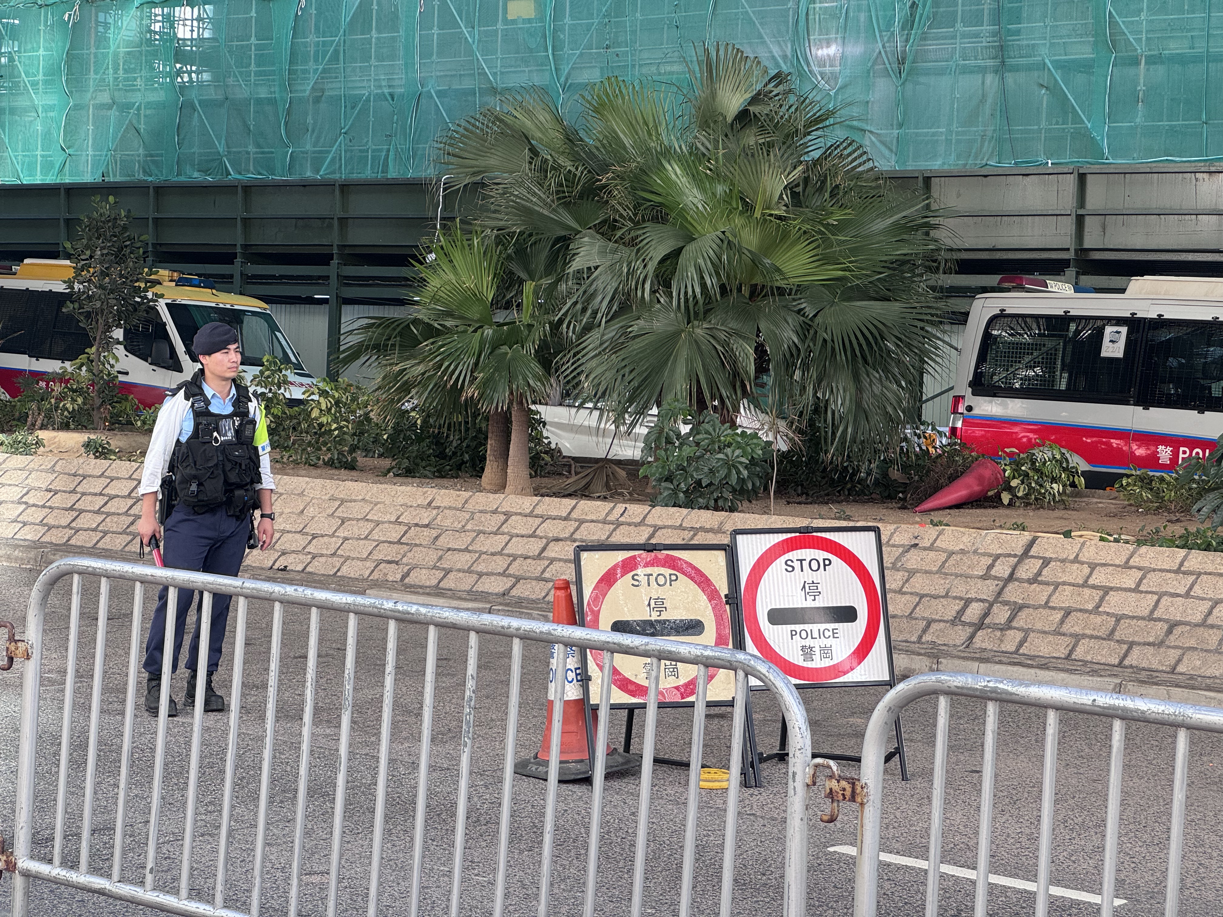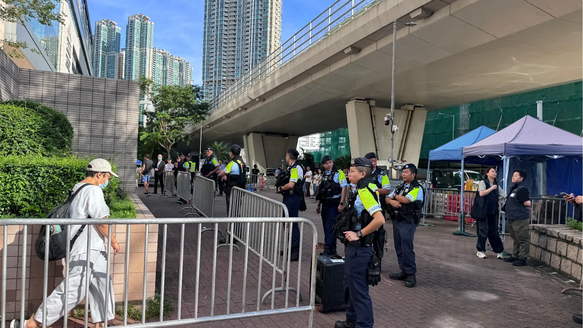 今早,西九龍裁判法院外保安措施顯著加強,至少十多輛警車駐守戒備,數十名穿着防刺戰術背心的警員在場巡邏,有警犬協助執勤搜索。同時,警方在法院外圍設置警崗,對可疑車輛進行搜查,確保沒有危險物品。