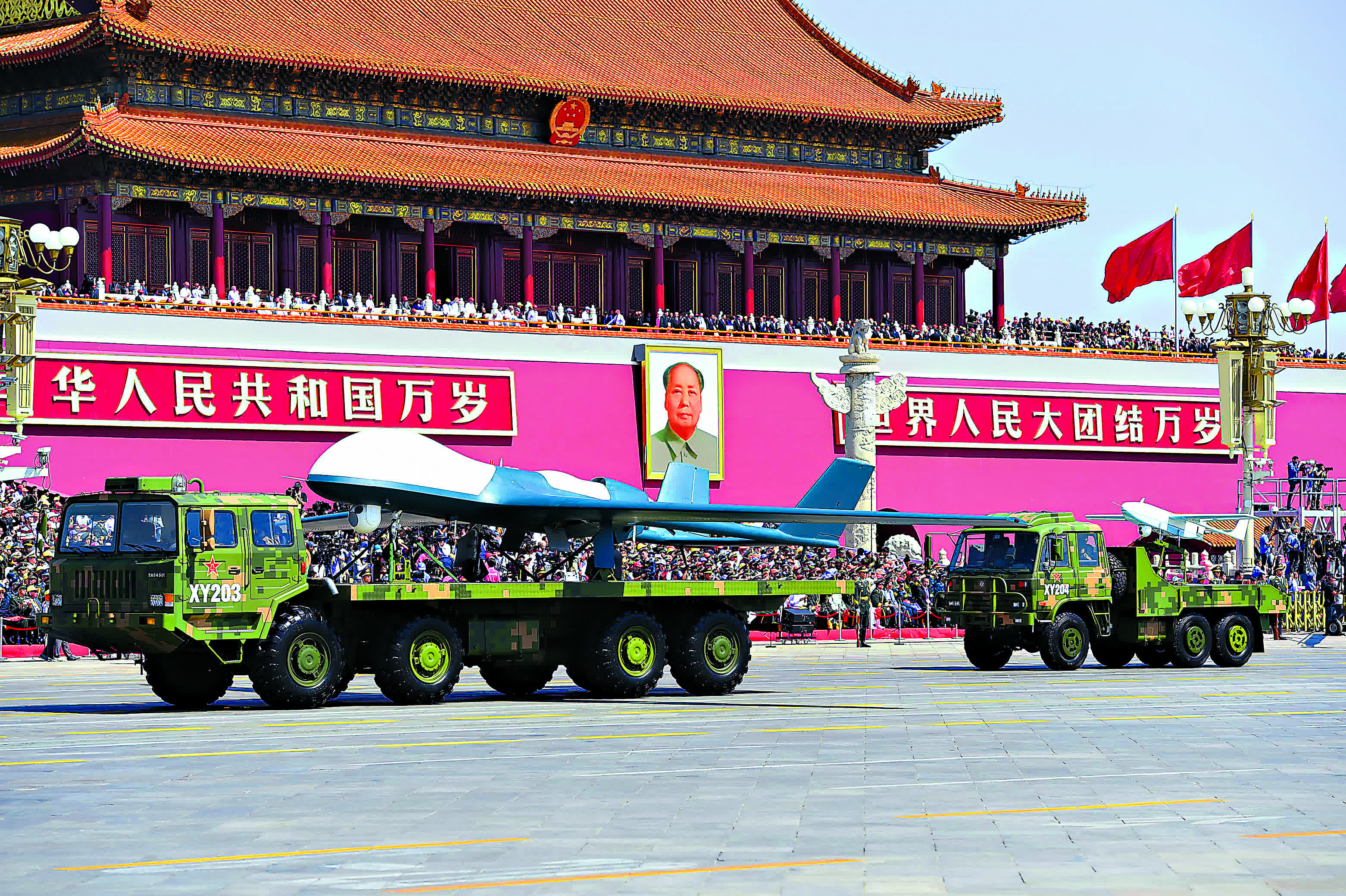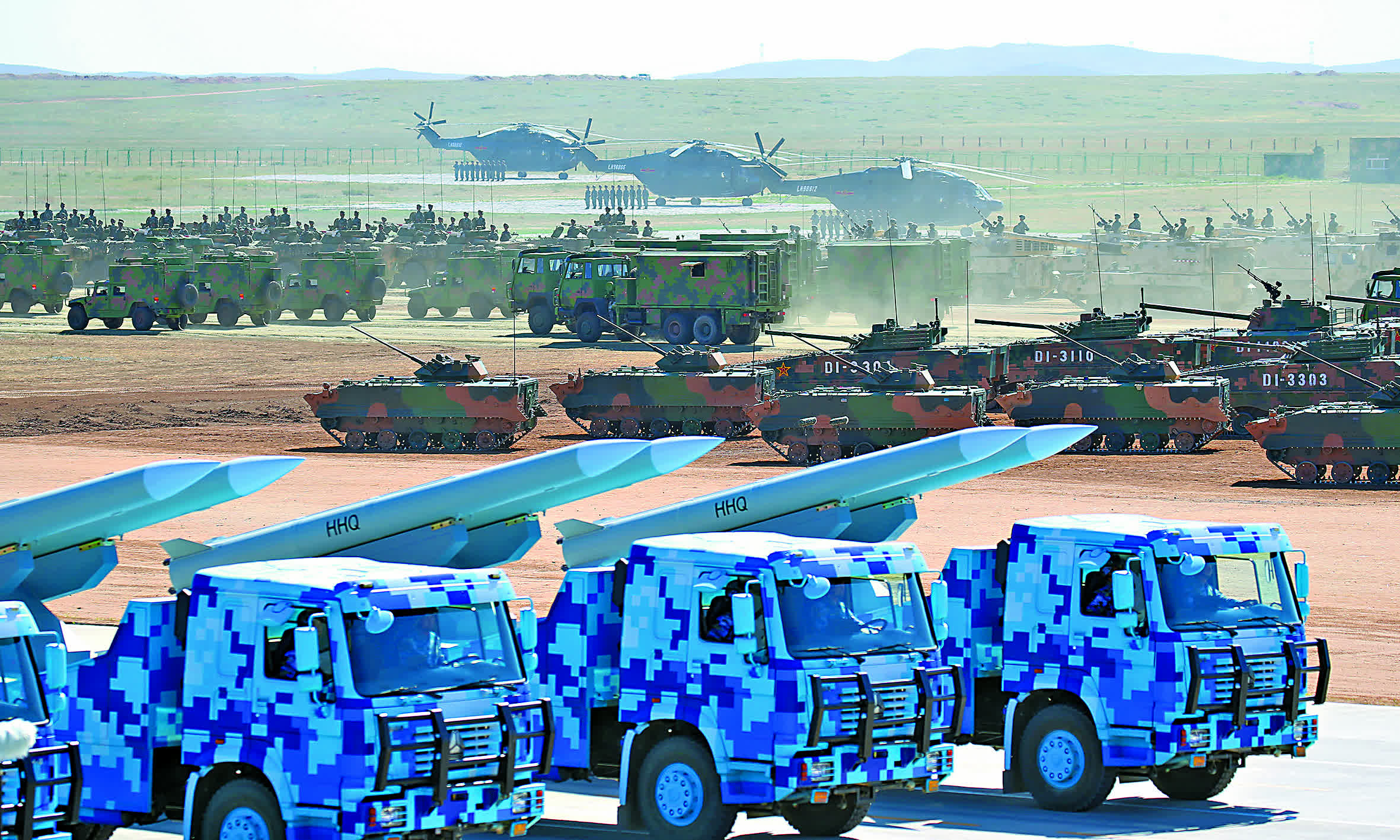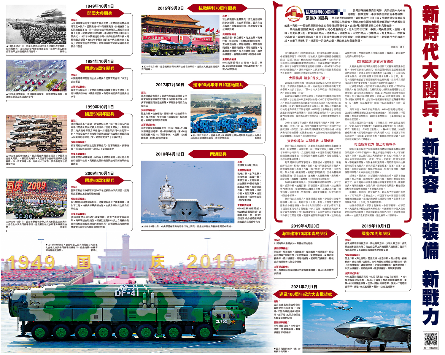 主要新式裝備:40%武器裝備首次亮相,包括「黑豹」15式「新輕坦」、191型遠程箱式火箭炮、轟-6N「雷神」加油型戰略轟炸機、東風-41洲際彈道導彈、巨浪-2潛射洲際導彈、東風-17高超聲速導彈、鷹擊-18反艦導彈、長劍-100巡航導彈等