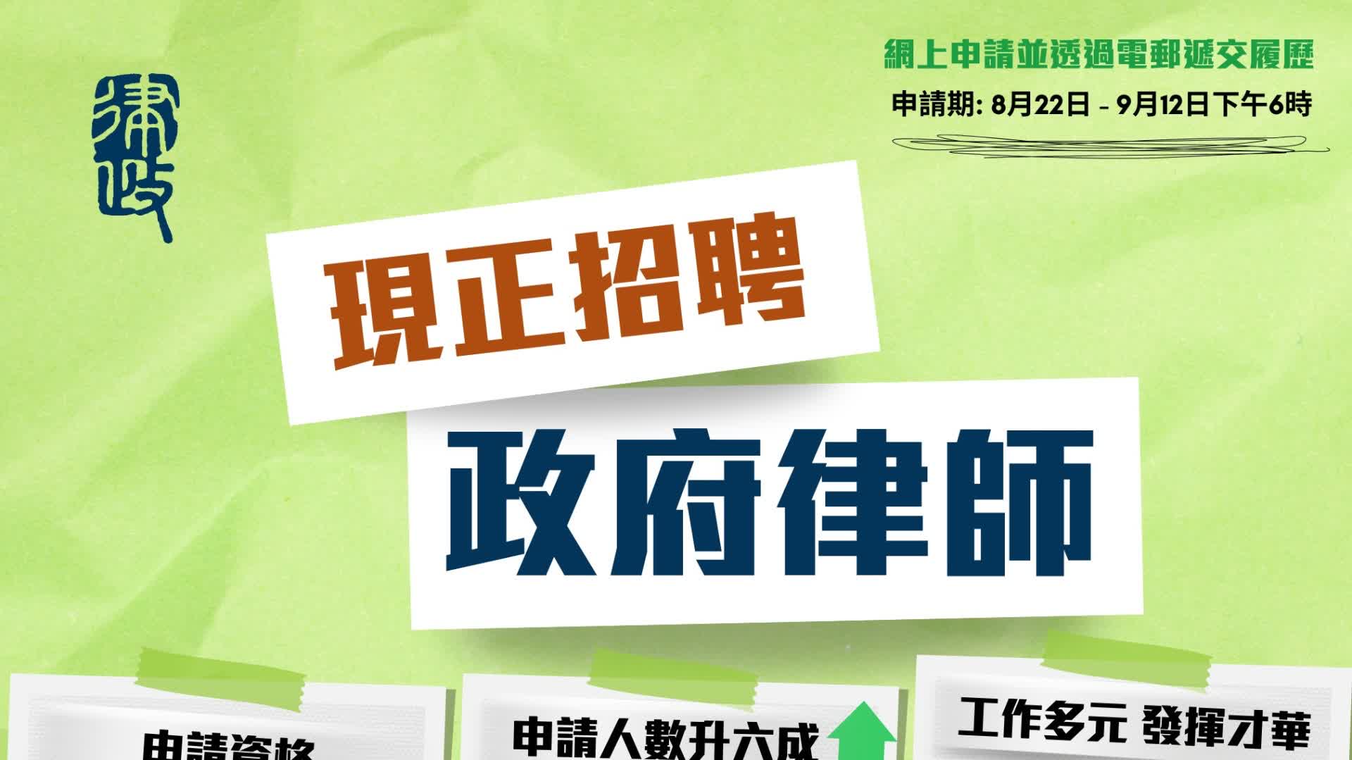 律政司今日起展開相關的招聘工作,並於9月3日舉行招聘簡介會,有意投考者可親身或網上參與。職位申請需透過網上提交,並電郵履歷,截止日期為9月12日下午6時。
