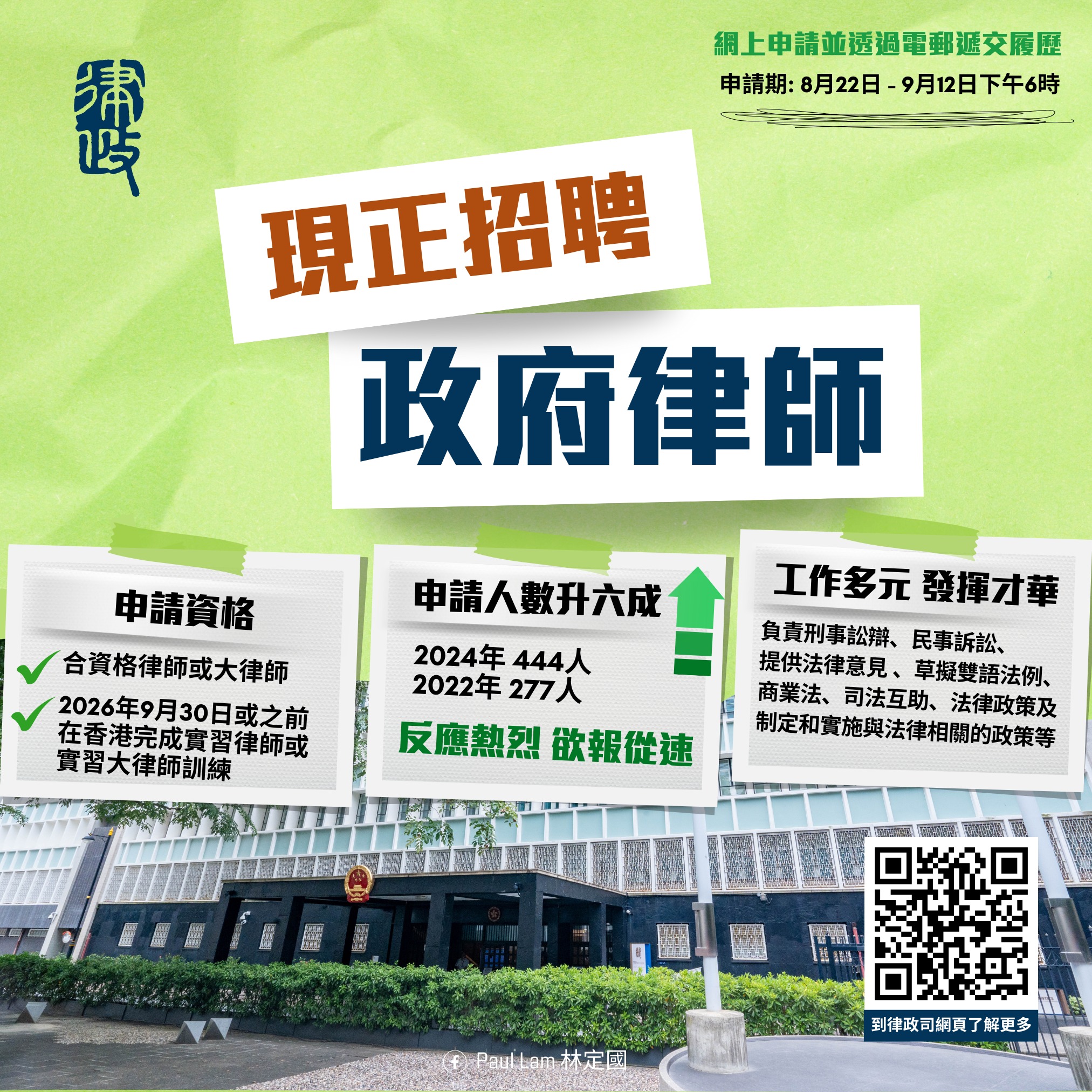大公文匯全媒體報道,律政司司長林定國今日(22日)在社交平台發文指,政府律師現正展開公開招聘,誠邀合資格律師或大律師申請,於2026年9月或以前完成實習期的實習律師或實習大律師,亦可遞交申請。