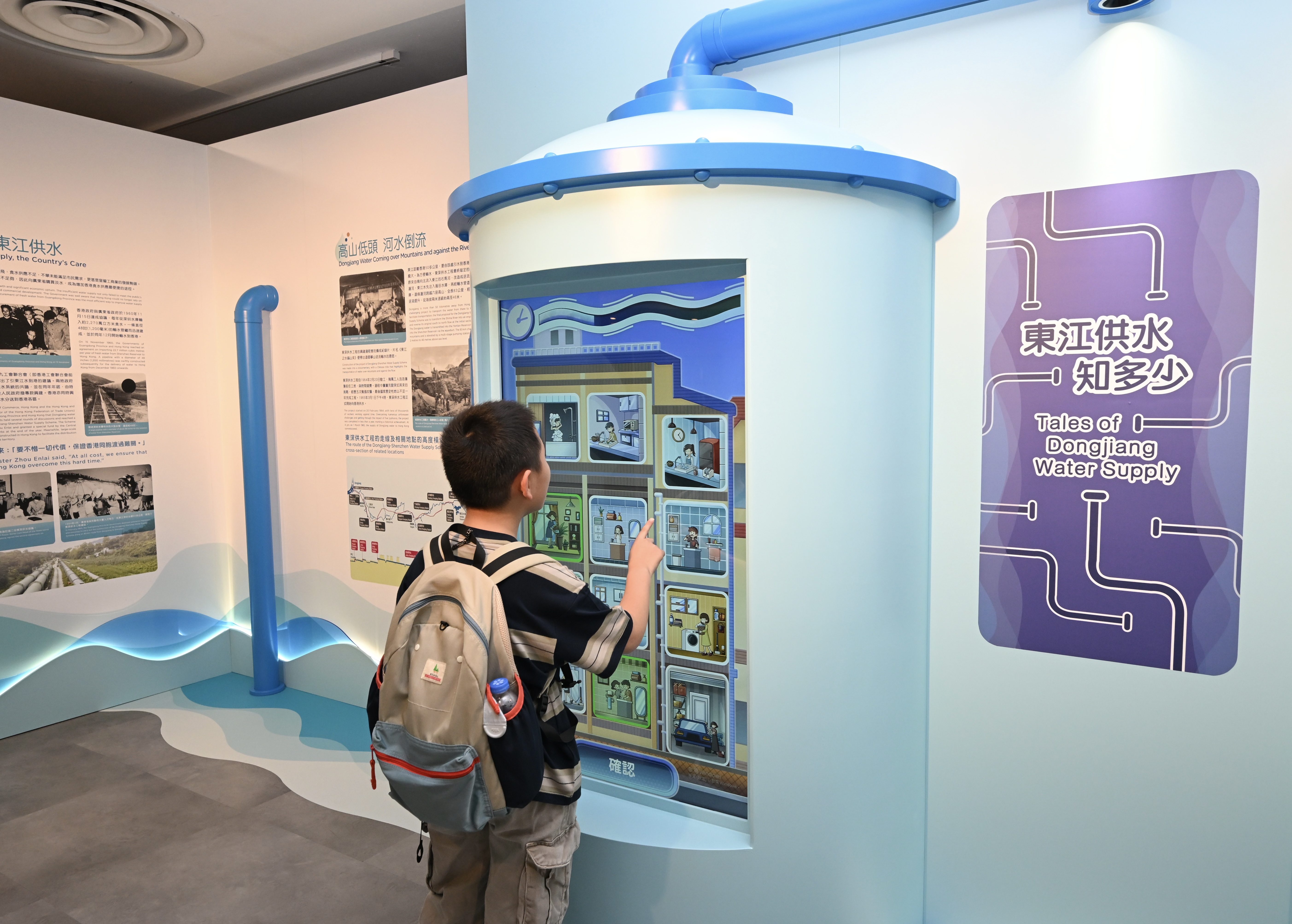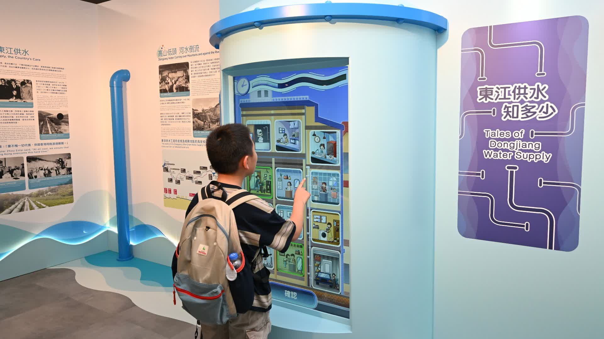 展覽亦設有互動問答遊戲,讓市民從多角度了解這個龐大的供水工程,以及節約用水的方法。場內並展示較早前舉行的「慶祝東江水供港60周年」小學親子繪畫比賽得獎作品。
