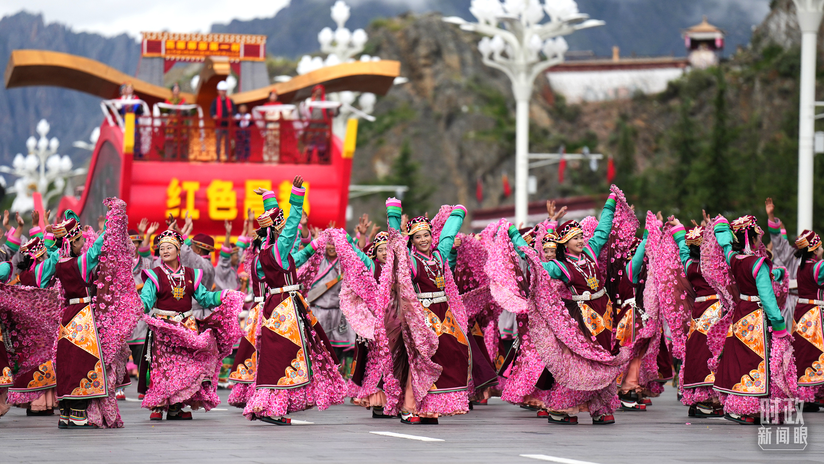 六十載櫛風沐雨,一甲子滄海桑田。格桑花海群舞中,悠揚的扎念琴聲響起,雄渾的甲諧舞、瓊結卓舞、弦子舞、鍋莊舞、普蘭宣舞應接不暇,舞出西藏繁榮發展的精氣神。身穿工布服飾、飛天服飾等藏族特有服飾的遊行群眾,以一場非物質文化遺產的盛宴向西藏自治區成立60周年獻禮。