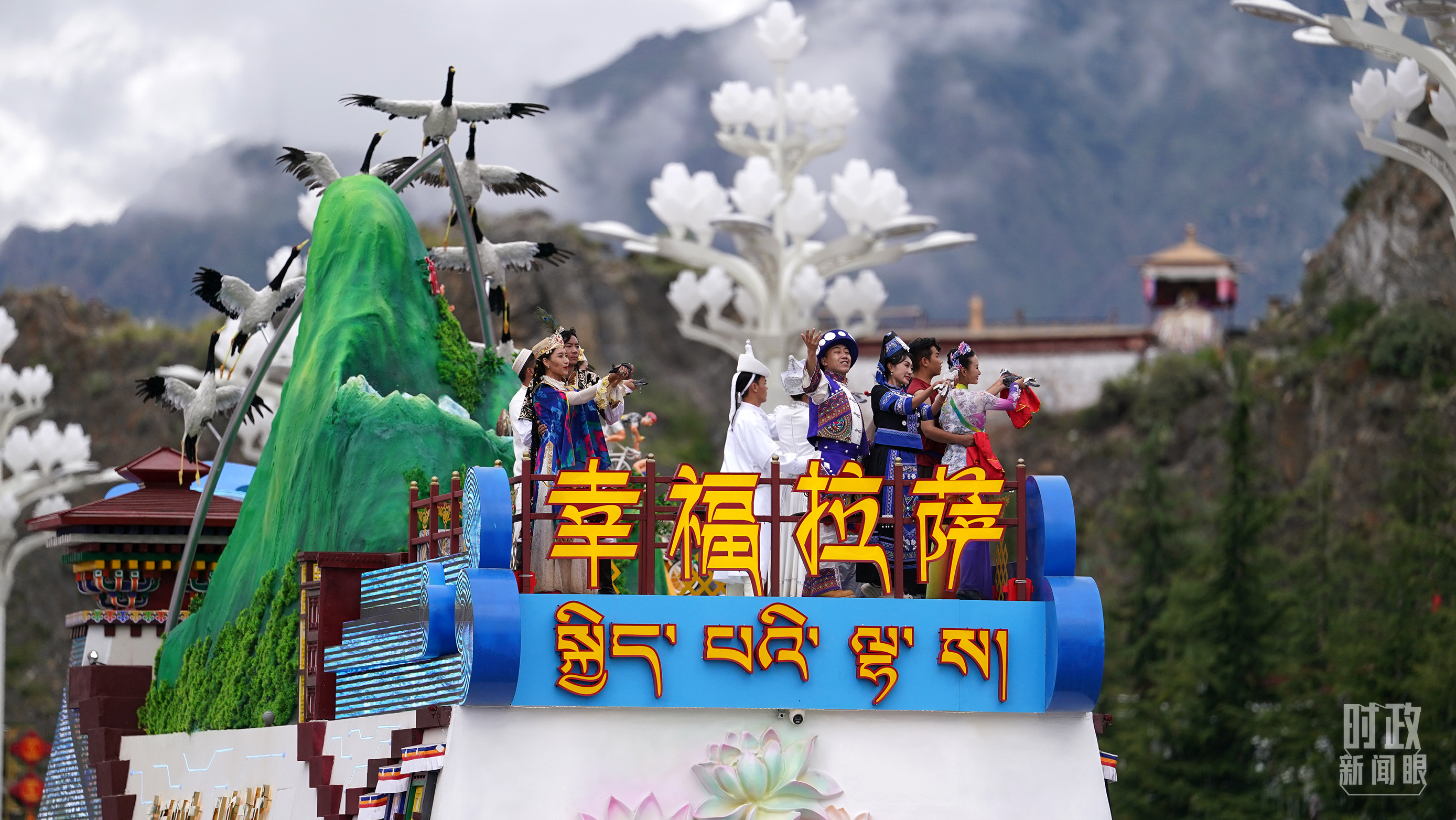 在「奮進新時代」單元中,西藏7個地市的遊行方隊和彩車獨具風格,是生動展現地方特色的窗口。例如,「幸福拉薩」彩車的雪蓮花、「開放的日喀則」彩車的雲端哨所、「藏源山南」彩車的雅魯藏布江、「醉美林芝」彩車的桃花、「紅色昌都」彩車的西藏解放第一村、「極地那曲」彩車的藏羚羊、「天上阿里」彩車的岡底斯山脈等。