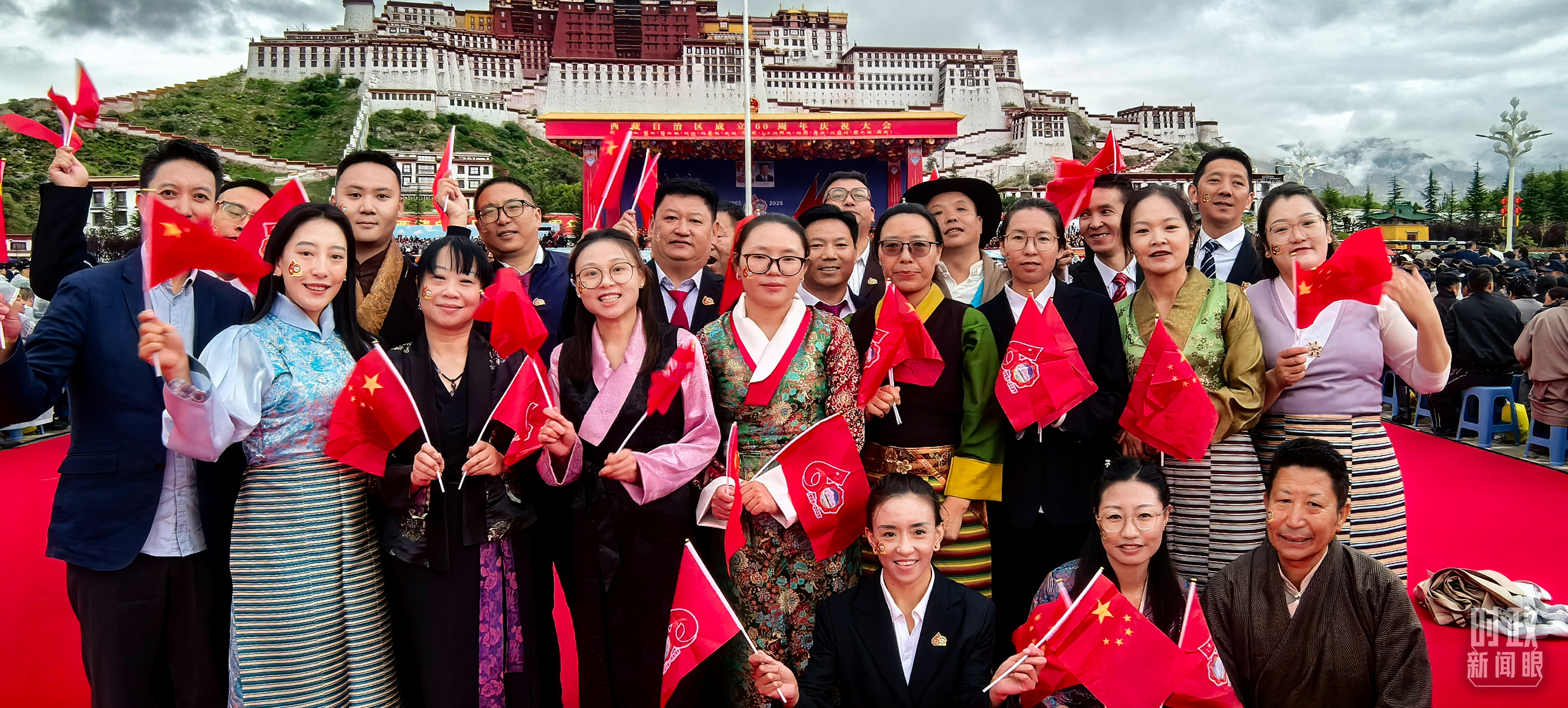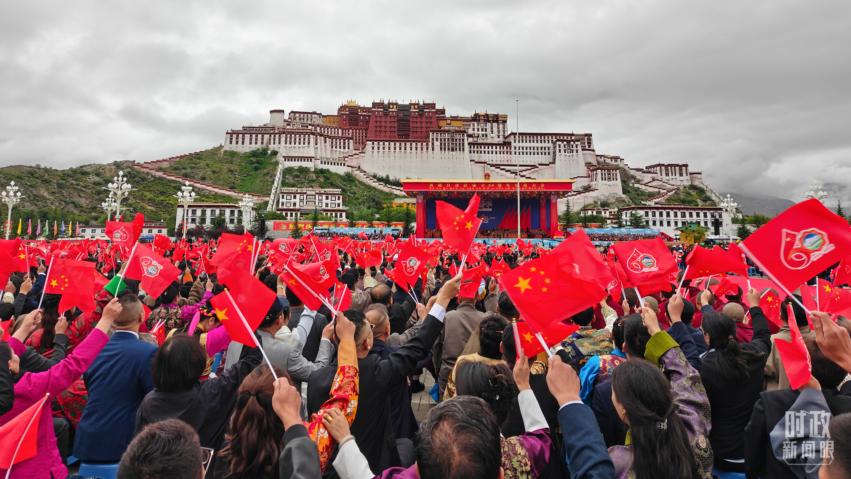 慶祝大會的會場設置在雄偉的布達拉宮前,位於群山環抱之中。大會主席台採用藏式風格。約2萬人歡聚布達拉宮廣場,紅、黃、白、藍等體現藏族文化基因的色彩鋪滿眼前,烘托出吉祥喜慶的濃烈氛圍。