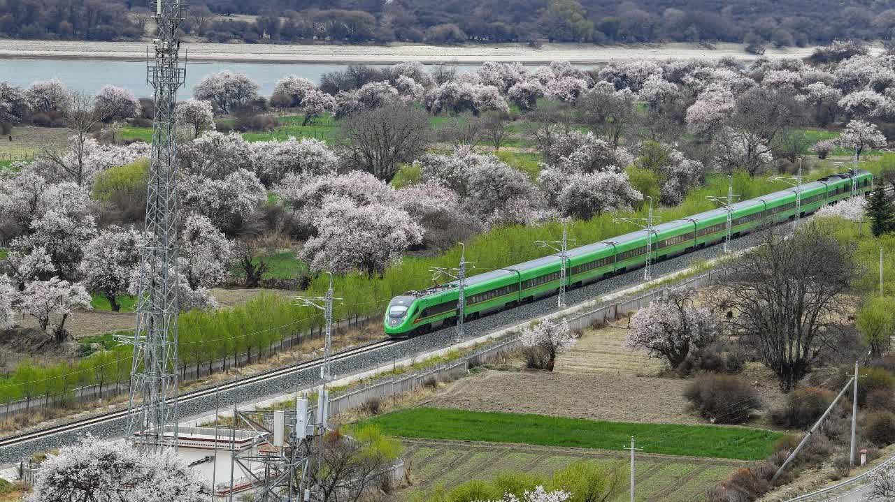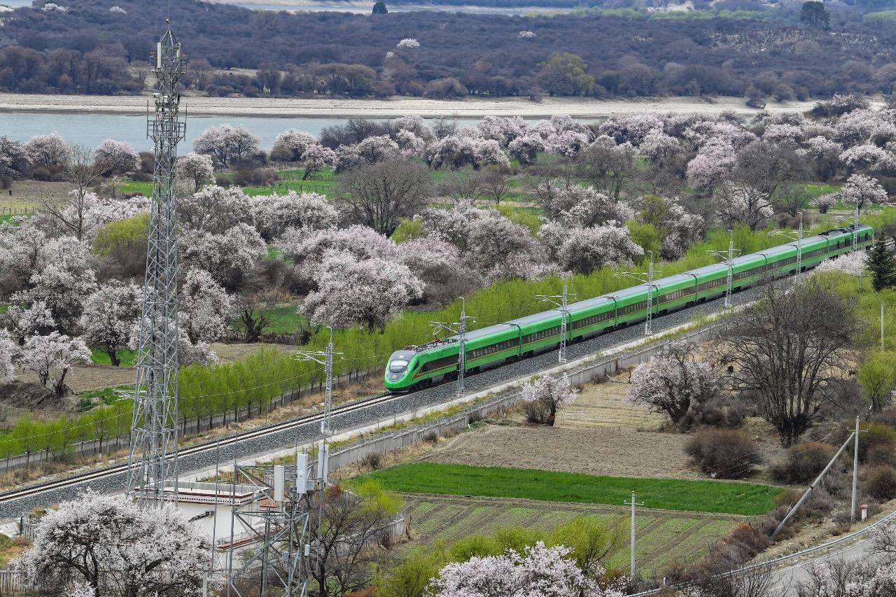 雅魯藏布江河谷中,拉林鐵路上的復興號列車呼嘯而過。自2021年6月開通運營以來,拉林鐵路有力推動了區域經濟和民生發展。