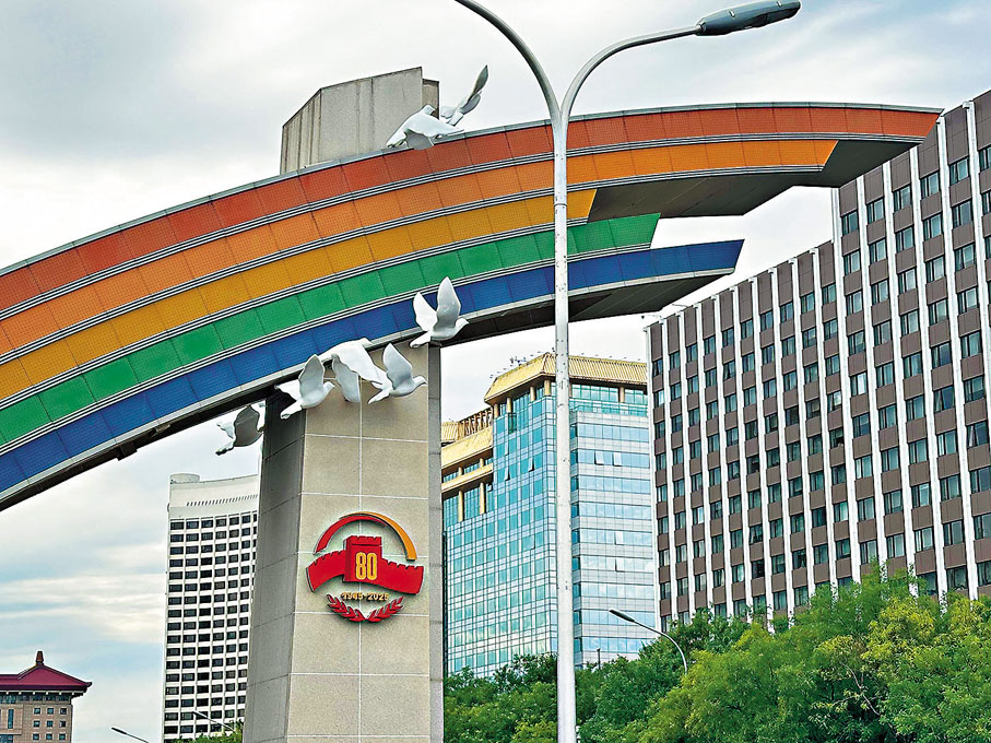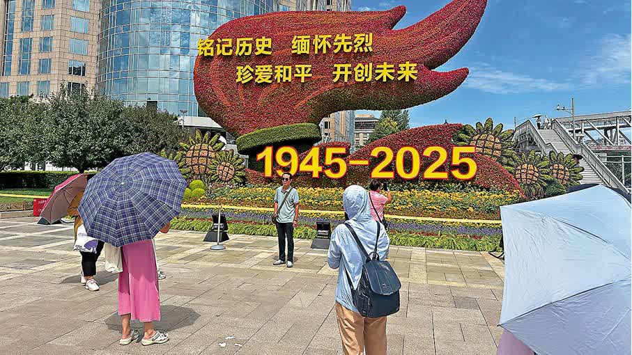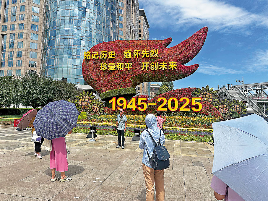 (香港文匯報記者 蘇雨潤)9月3日是中國人民抗日戰爭暨世界反法西斯戰爭勝利80周年紀念日,當日將在北京舉行盛大閱兵式。目前,閱兵各項準備已基本完成。香港文匯報記者22日看到,北京城內四處洋溢着深厚的紀念氛圍,不僅長安街沿線10組大型主題花壇已基本完工,北京不少地方也都增加了大量與抗戰勝利相關的主題元素,如建國門的彩虹橋裝飾了和平鴿等紀念標識,東南二環左安門橋附近懸掛了多條以「隆重紀念中國人民抗日戰爭暨世界反法西斯戰爭勝利80周年」 為主題的標語橫幅。當談及對閱兵式的期待,不少民眾表示,希望當天能看到更多新武器裝備,「要把我們的實力展示給世界看,中國早已不是百年前任人欺負的國家了」。