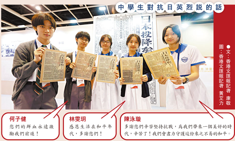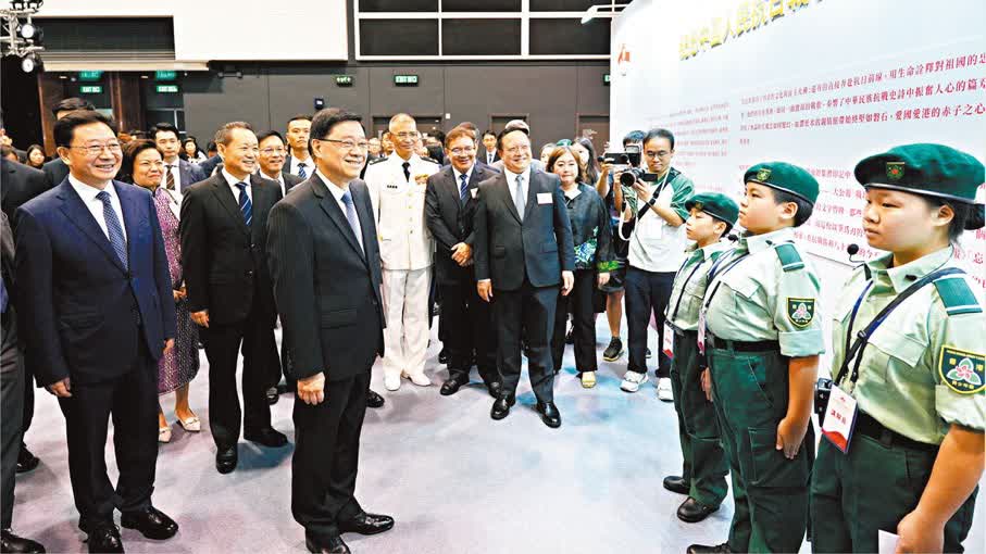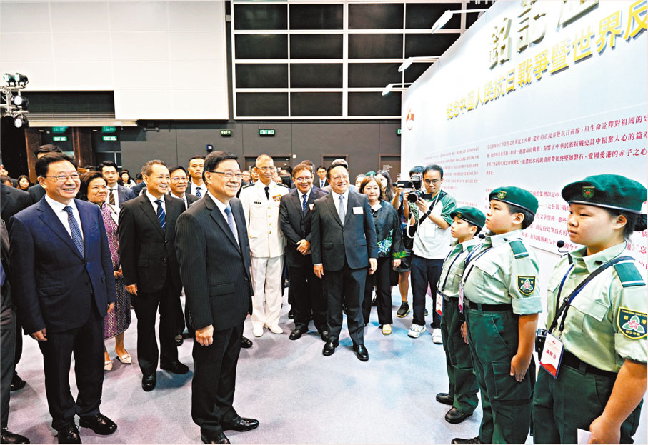 (香港文匯報記者 康敬、吳健怡、洪澤楷)「銘記歷史 珍愛和平─紀念中國人民抗日戰爭暨世界反法西斯戰爭勝利80周年大型巡迴展覽」,昨日起一連八天在香港會展中心舉行。昨日舉行隆重的開幕典禮,香港特區行政長官李家超、中央政府駐港聯絡辦主任周霽出席及致辭,勉勵香港社會各界薪火相傳,眾志成城。全國政協委員、香港大公文匯傳媒集團董事長兼香港文匯報社社長、大公報社社長李大宏致歡迎辭。中央政府駐港國安公署署長董經緯、外交部駐港特派員崔建春、解放軍駐港部隊副司令員譚志偉等主禮嘉賓,以及逾200位社會各界代表人士出席開幕禮。