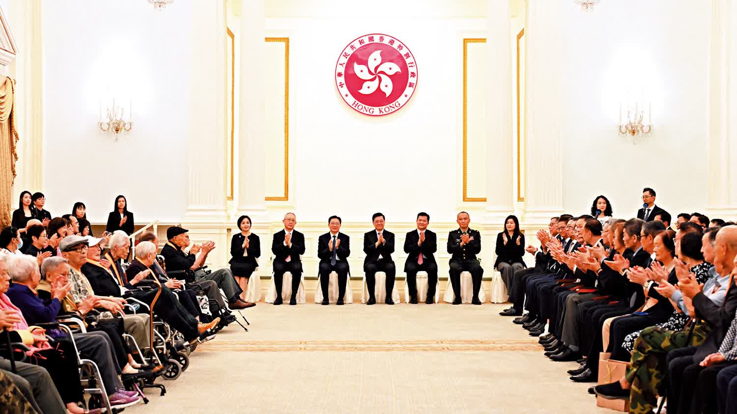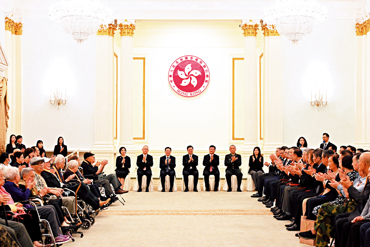 (大公報記者 龔學鳴 報道)特區政府昨日於香港禮賓府舉行「中國人民抗日戰爭勝利80周年紀念章頒授儀式」。行政長官李家超在致辭中表示:「香港民眾與祖國同胞眾志成城、無懼犧牲,積極投身抗戰前線,保衛家園。其中,很多香港市民加入東江縱隊和港九大隊,每位隊員都奮勇抗敵,全面開展游擊戰爭,多次營救受困的文化人士、盟軍成員等,展現堅毅不屈的愛國情懷。」
