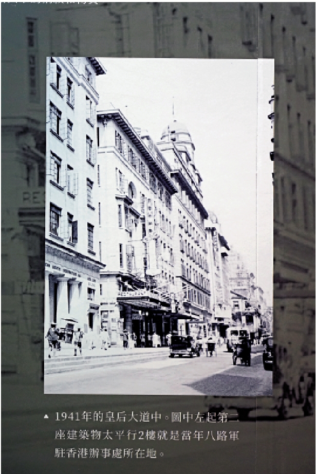 在展覽的第二展區「血濃於水 烽火旌旗」的第二部分「香港的淪陷」中,有一張拍攝於1941年的照片,向觀眾展現了位於皇后大道中18號的前八路軍駐香港辦事處所在地的情況。