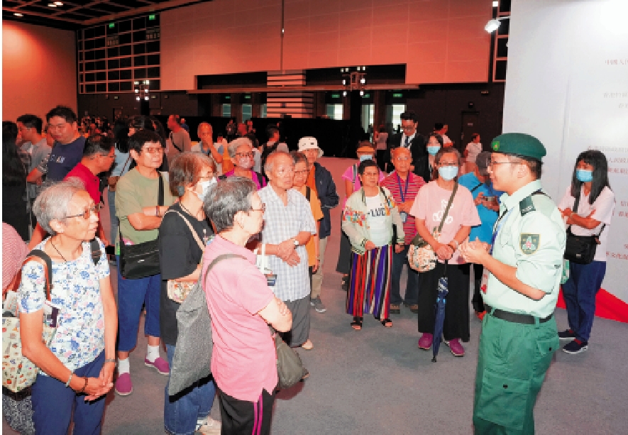 「說真的,我今天能站在這裏與各位聊天,還能自由地呼吸每一口空氣,全靠他們(先輩們)換來的,沒有他們,就沒有現在的我。」展覽上,來自香港青少年軍總會的導賞員羅兆希慷慨激昂地介紹香港在日軍投降後的情景,來自香港廣西社團總會的一群長者將他圍在中間,全神貫注地聆聽他的講解,又時不時與他交流意見。