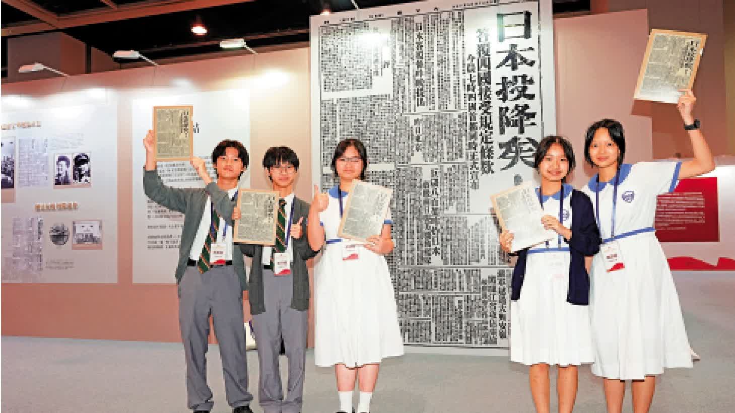 即將升中五的林同學指着當年《大公報》頭版「日本投降矣!」五個大字說道:「這五個字背後,不僅僅是中國人民抗日戰爭的勝利,亦是全世界人民共同分享和平的喜悅。」