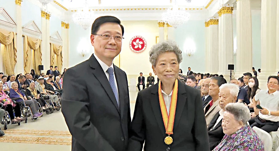 (香港文匯報記者 李千尋)獲特區政府頒發國家授予紀念章的90歲抗戰老兵林珍,年僅8歲就加入游擊隊,先後擔任通信員及護理員。她昨日在接受香港文匯報訪問時,憶述當年翻山越嶺傳遞情報的驚險歷程,並回憶其大姐在日軍控制下搜集情報的艱苦歲月。她強調,獲頒紀念章固然欣慰,但這份榮譽屬於所有曾為抗戰付出的無名英雄,「當年我們只是做了自己能做的事,而抗戰的偉大勝利,離不開中國共產黨的領導,離不開全體人民的團結,更離不開國際上愛好和平的國家與人民的支援。」